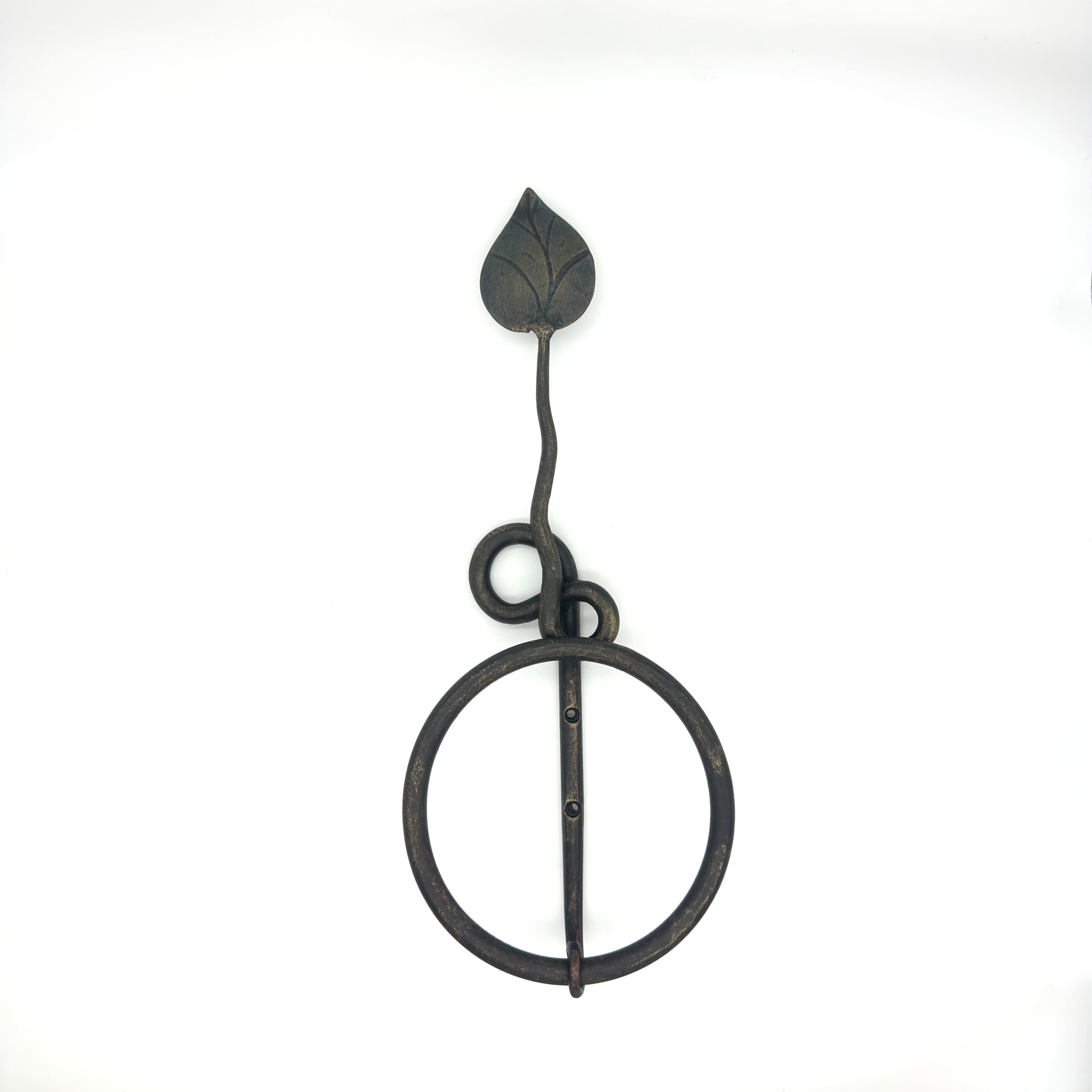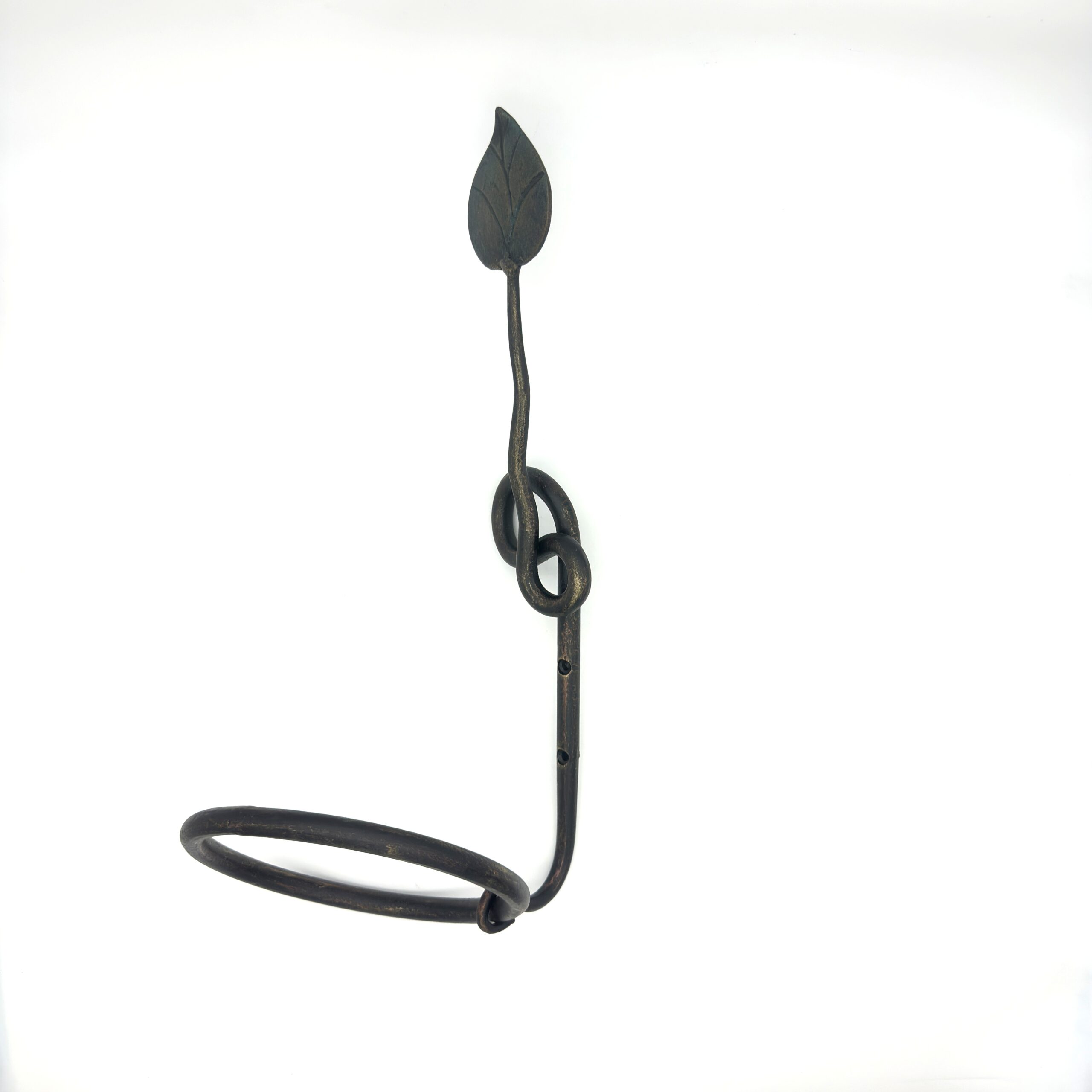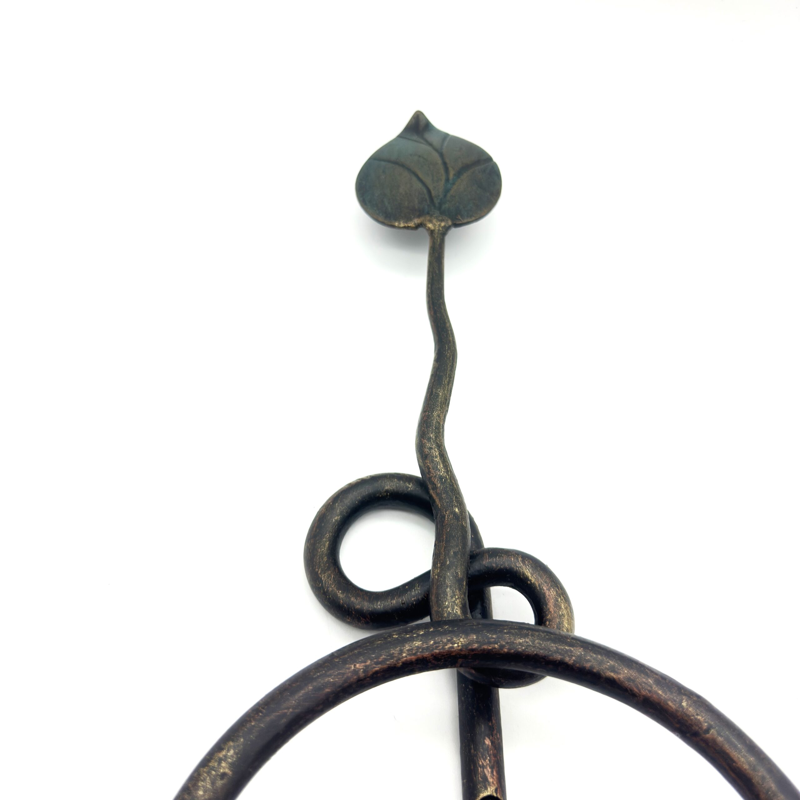 The Artisan’s Touch Crafted entirely from solid wrought iron, this piece features a long, elegant stem that mimics a climbing vine. Just above the functional ring, the iron is expertly twisted into a decorative knot, leading the eye up to a single, hand shaped botanical leaf. Every hammer mark tells the story of its creation at the anvil.