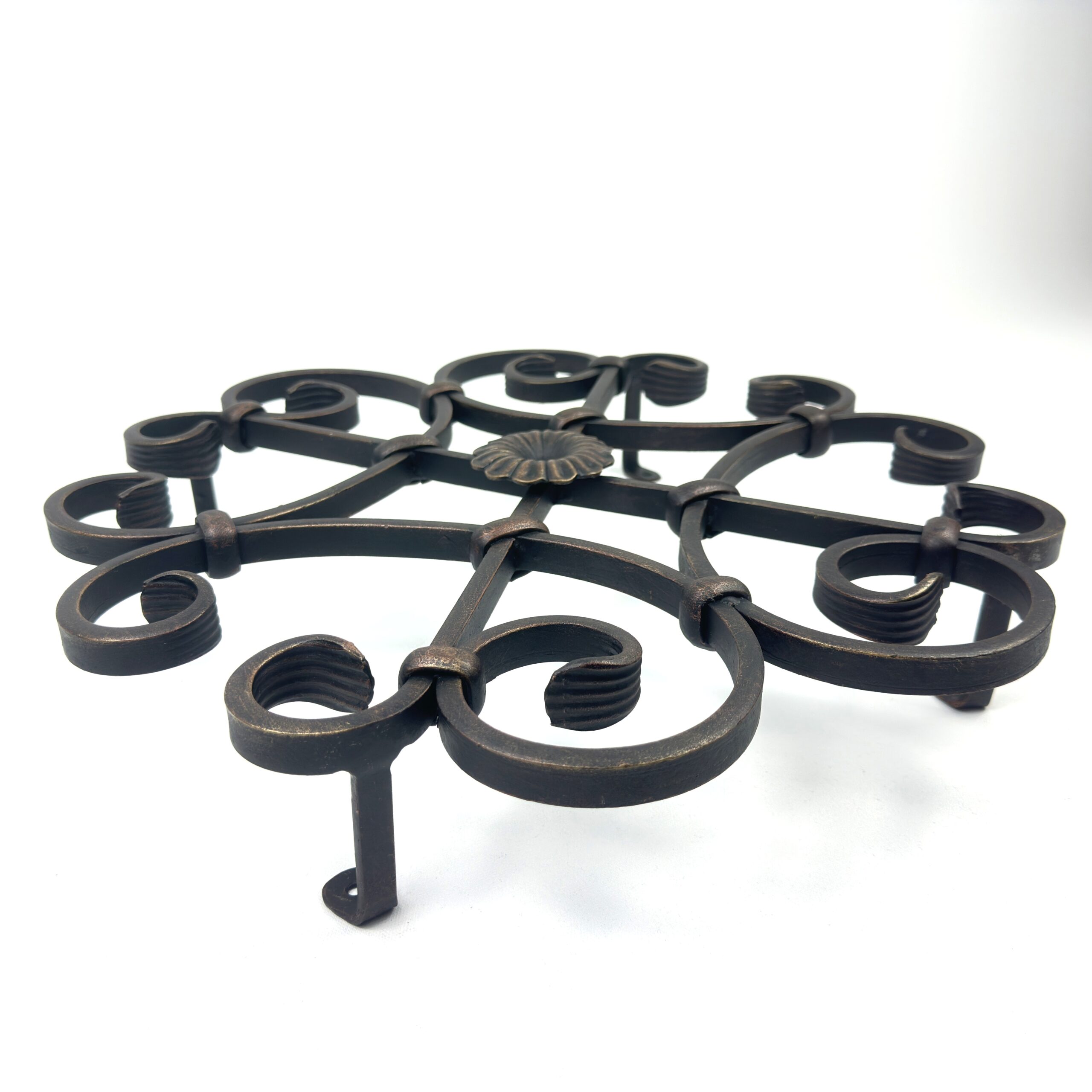 A masterpiece of symmetry. This hand forged iron wall sculpture features four scrolling arms meeting at a central floral rosette, offering architectural depth and antique charm.