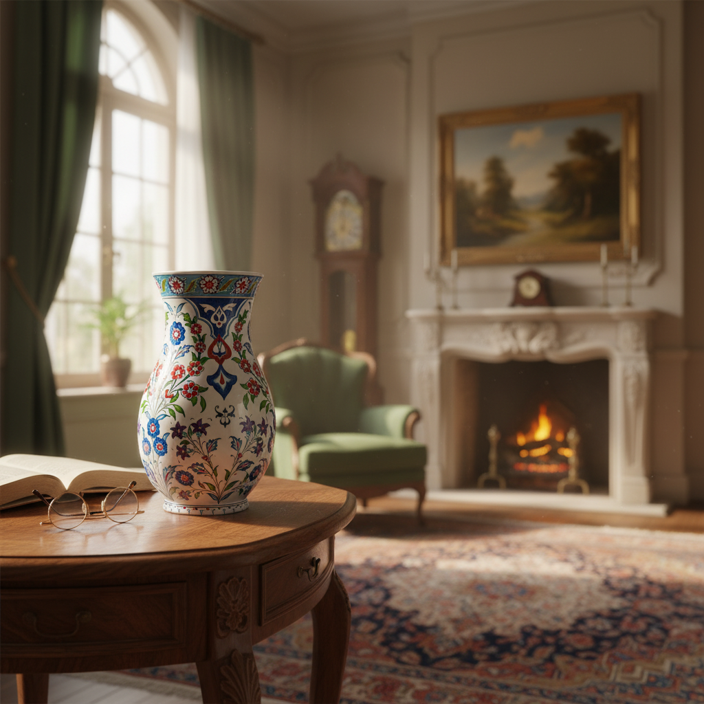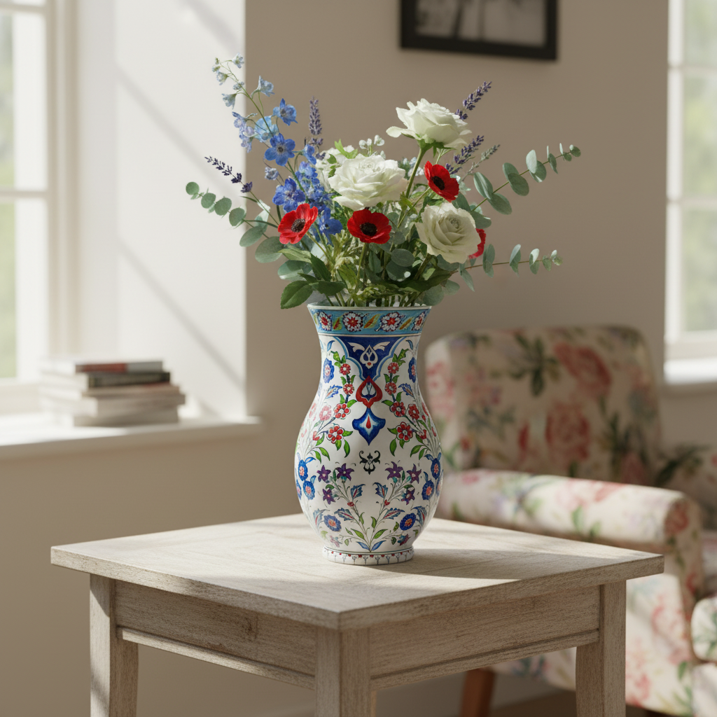 A Dance of Colors This vase tells a story of renewal. The artist has stepped away from strict tradition to include soft Violet and Purple blossoms among the vibrant red flowers. These climbing vines create a sense of upward movement, like nature awakening after winter.