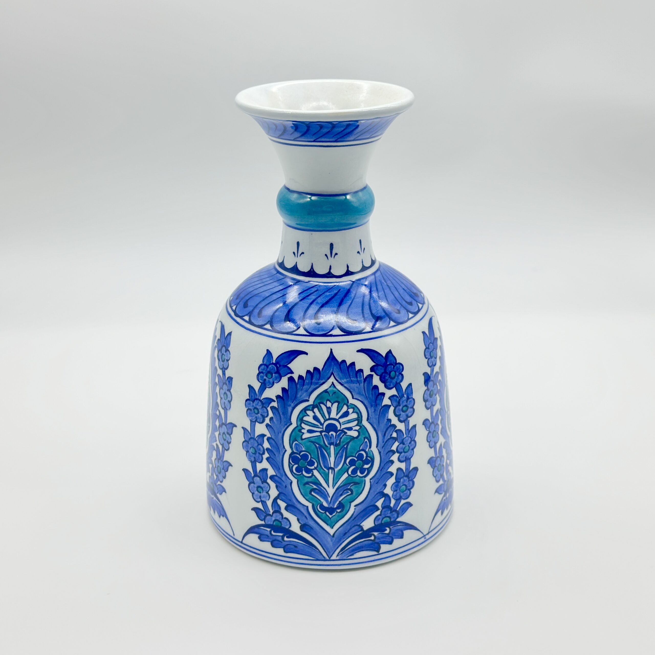 Serene elegance. This 20cm handmade “Bell” vase features a central floral medallion in soothing blue and turquoise tones, accented by a bright neck ring.