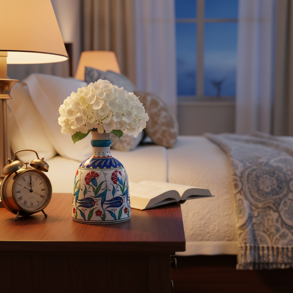 Jeweled Details What sets this piece apart is the attention to the neck. A vivid Turquoise Ring encircles the throat of the vase, flanked by blue geometric bands. It’s a small detail that draws the eye and balances the warmth of the red flowers.