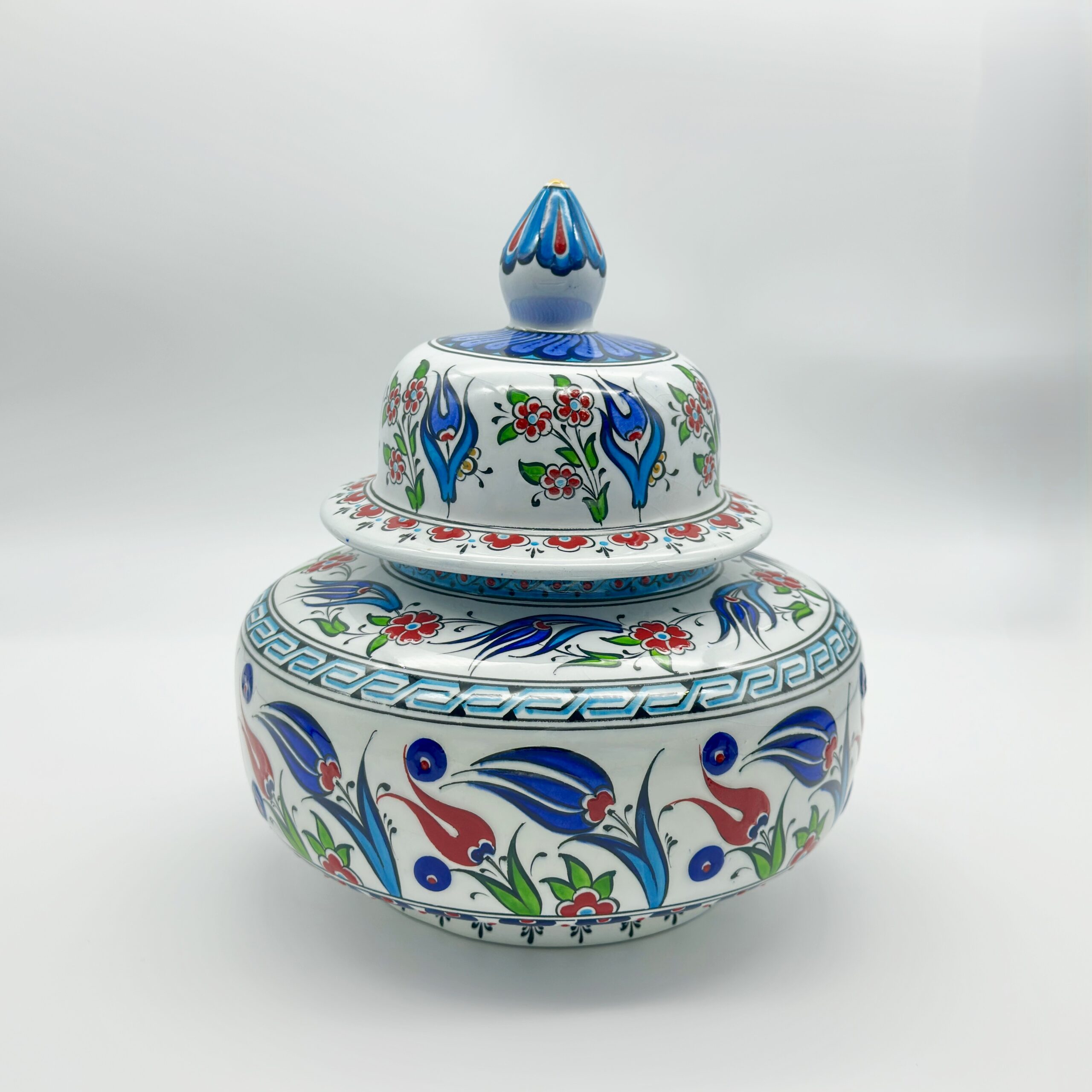 Handmade Ceramic Classic Iznik Jar with Lid Red Tulip and Meander Border