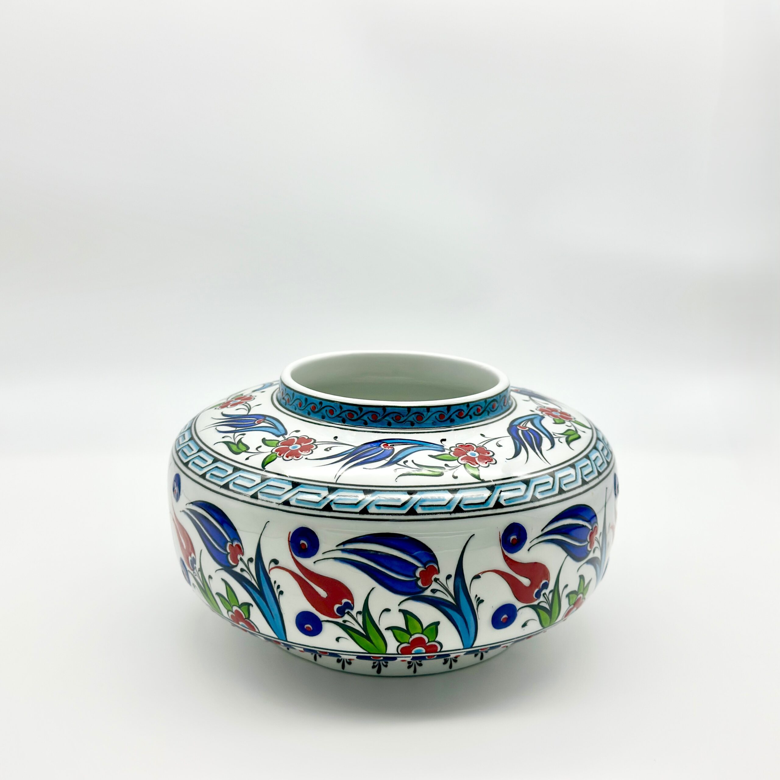 A piece of history. This handmade ceramic Classic Iznik jar features a traditional low profile silhouette decorated with dancing red tulips and a distinctive geometric meander border.