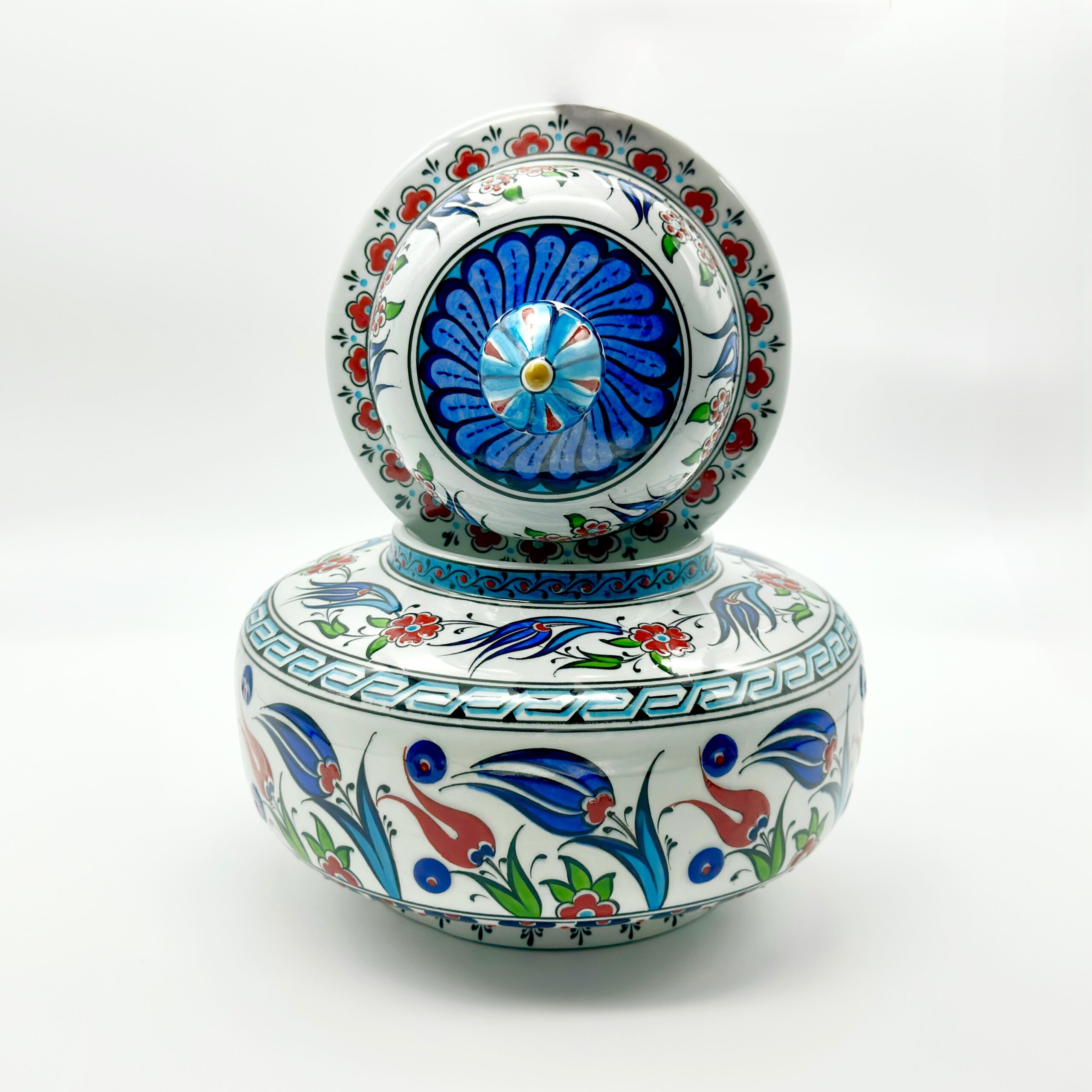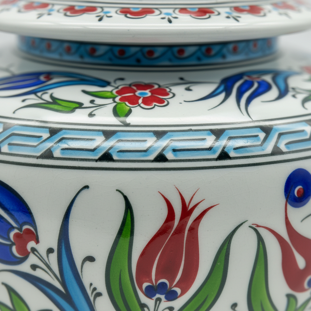 This Handmade Ceramic Classic Iznik Jar brings the golden age of Turkish ceramics into your home. With its traditional wide form, it carries the spirit of the ancient workshops where form and function were perfectly balanced.