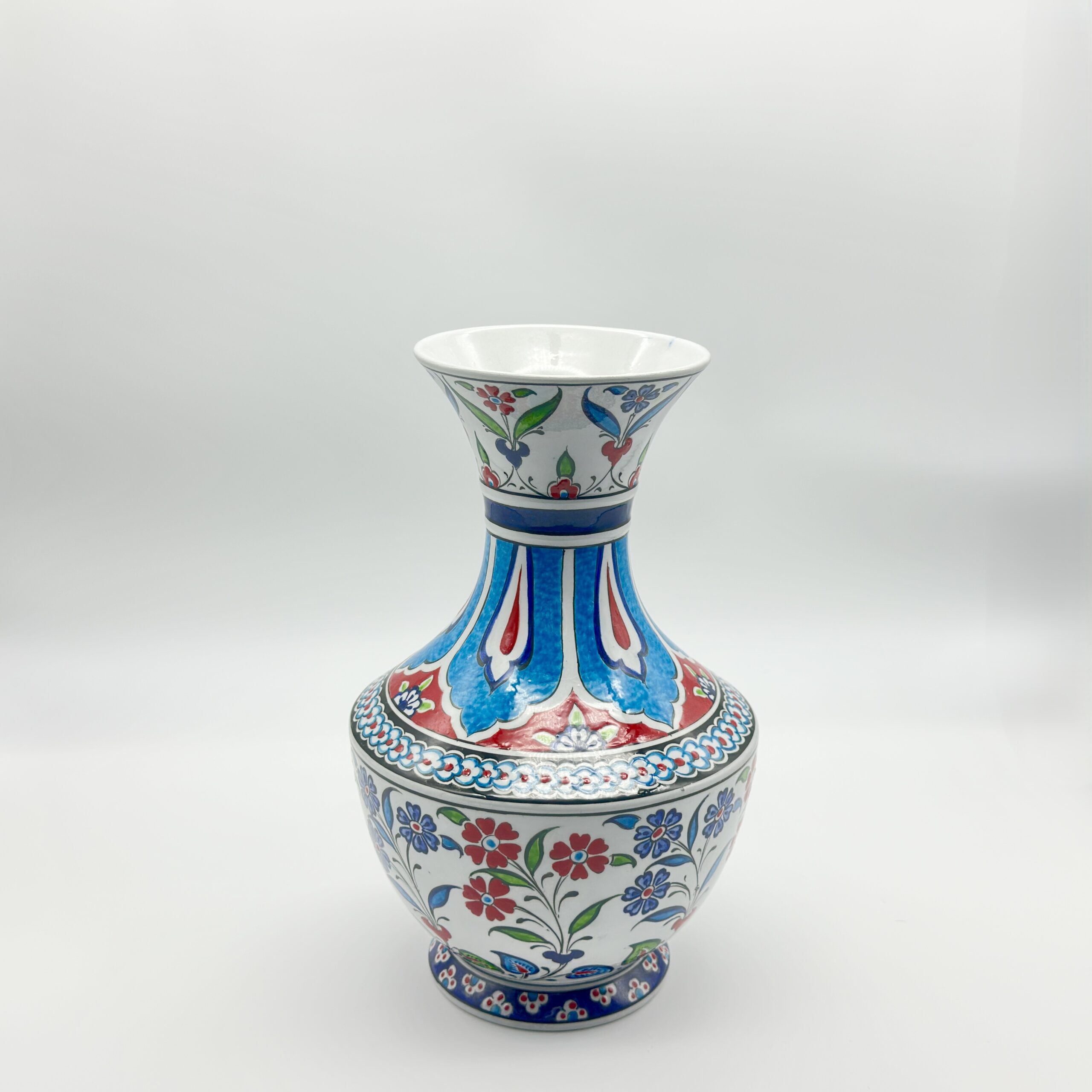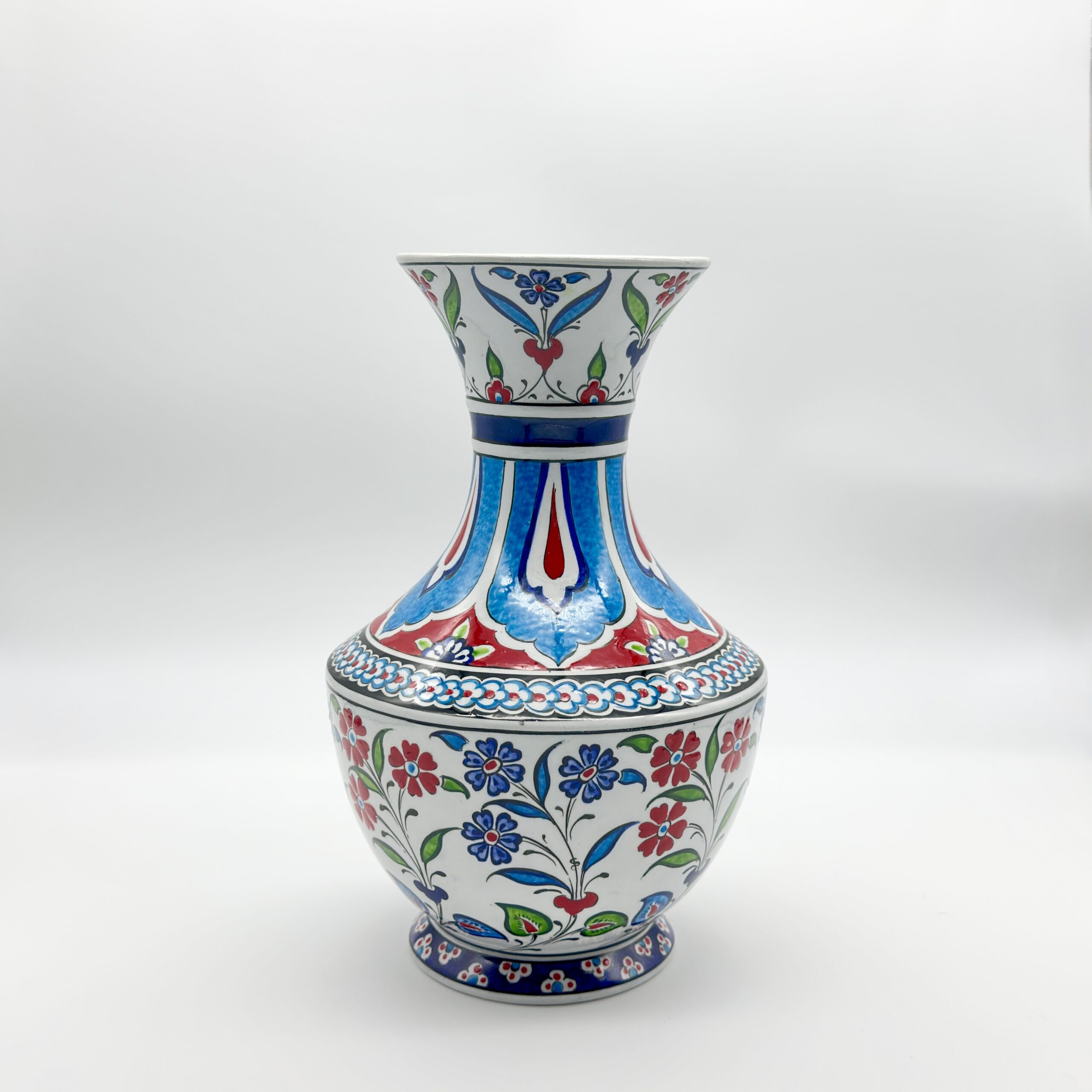 Handmade Ceramic Classic Vase (30cm) – Turquoise Panels & Red Floral Pattern – Mediterranean Summer Decor
