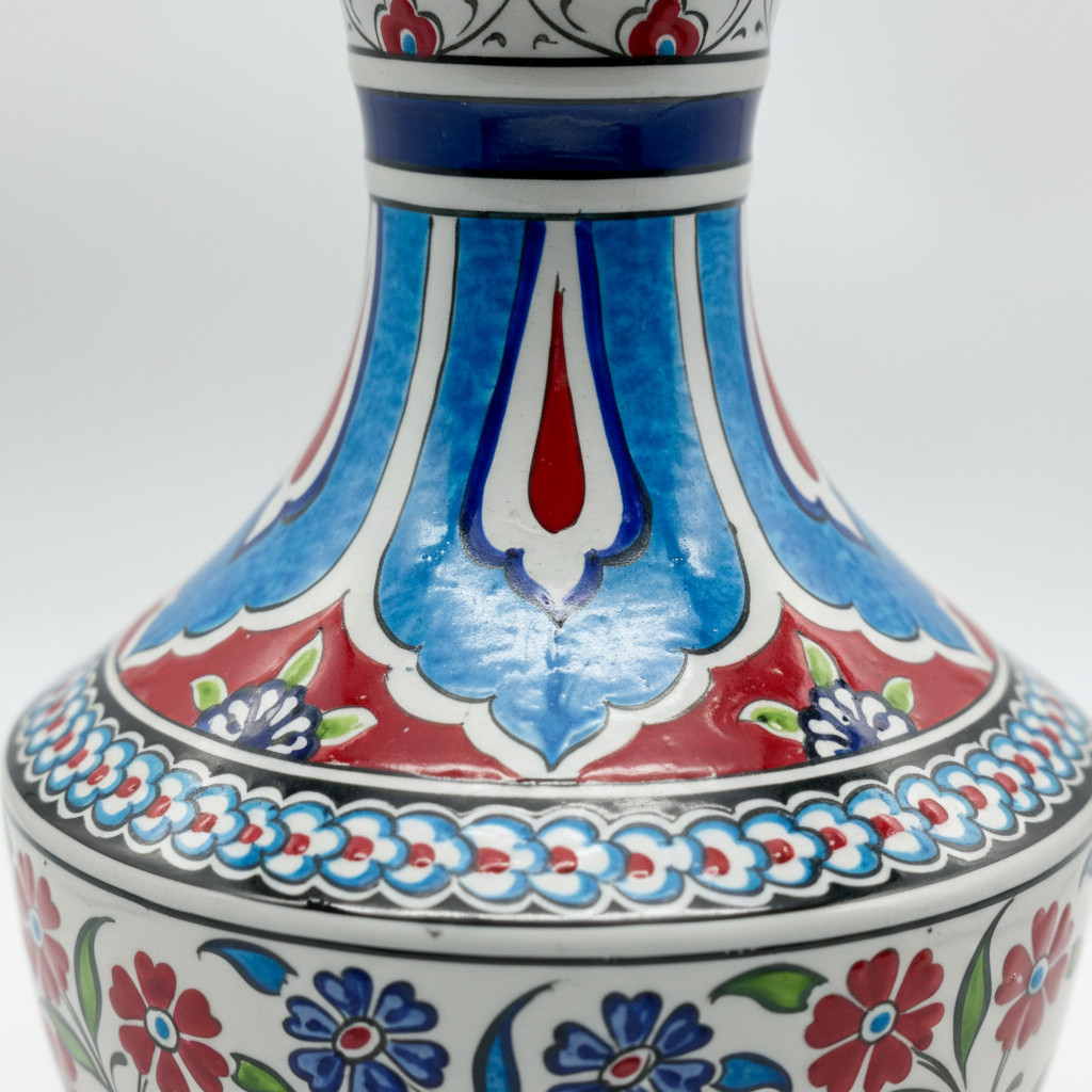 Structure Meets Nature The design is a beautiful conversation between geometry and nature. The neck is disciplined, featuring vertical architectural arches in turquoise and blue. As your eye travels down, this structure gives way to a relaxed, organic garden of Red Flowers and dancing leaves. It feels like looking through a tiled window into a blooming courtyard.