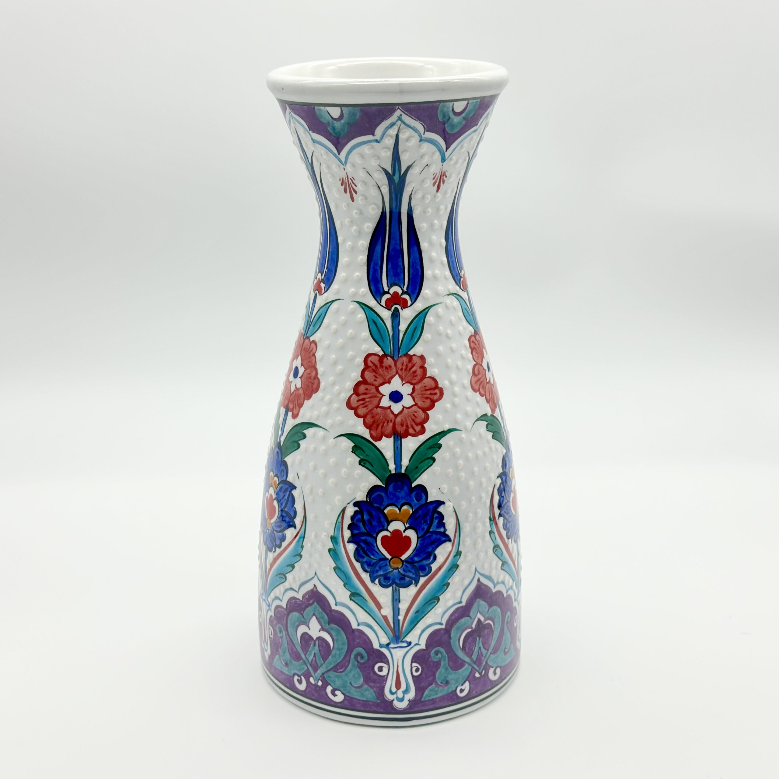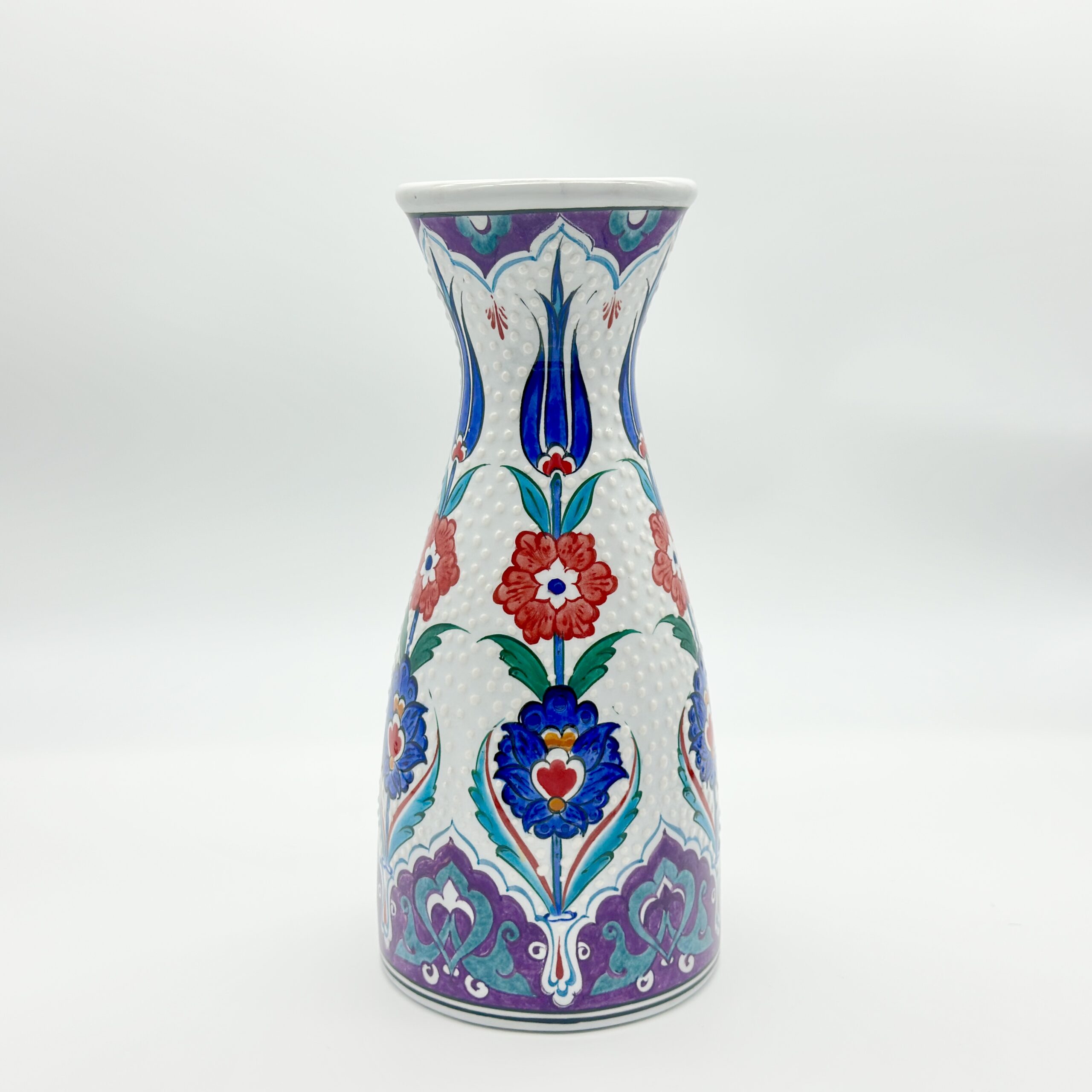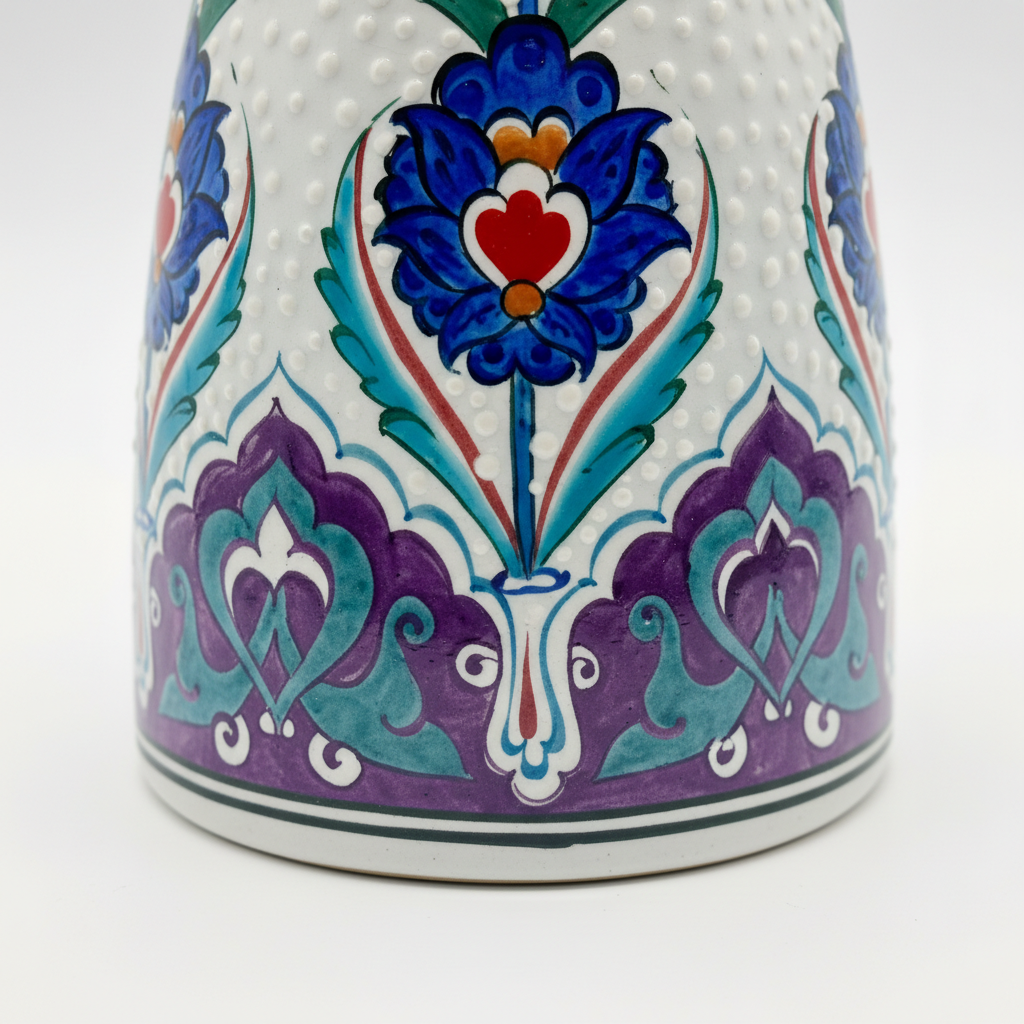 A Twist of Color While honoring the classic Iznik florals, this piece introduces a sophisticated twist: Purple. The geometric arches at the base and the accents on the neck are painted in a deep violet hue, offering a stunning contrast to the traditional coral reds and cobalt blues. It is a piece that feels both familiar and excitingly new.
