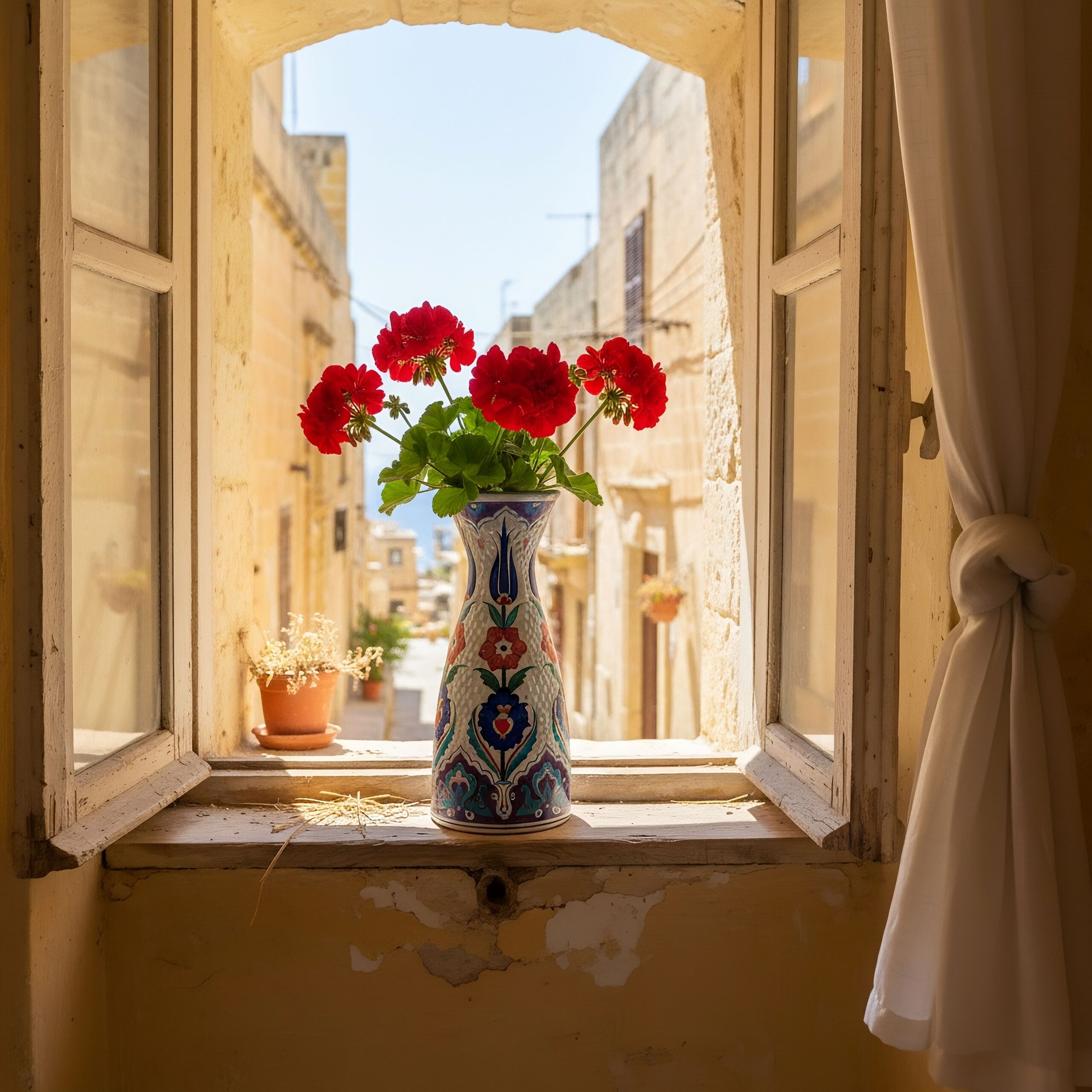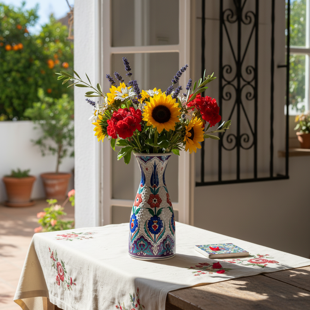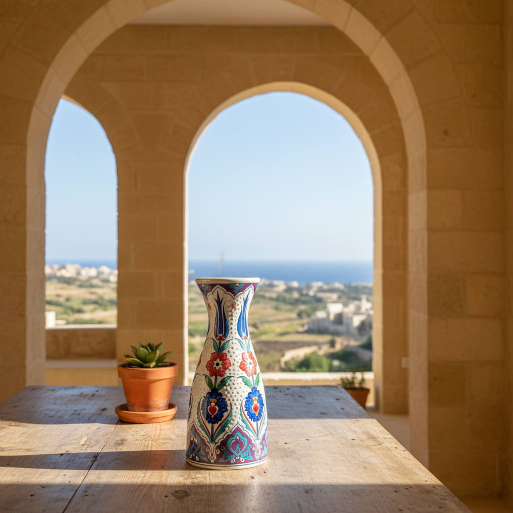 A Twist of Color While honoring the classic Iznik florals, this piece introduces a sophisticated twist: Purple. The geometric arches at the base and the accents on the neck are painted in a deep violet hue, offering a stunning contrast to the traditional coral reds and cobalt blues. It is a piece that feels both familiar and excitingly new.