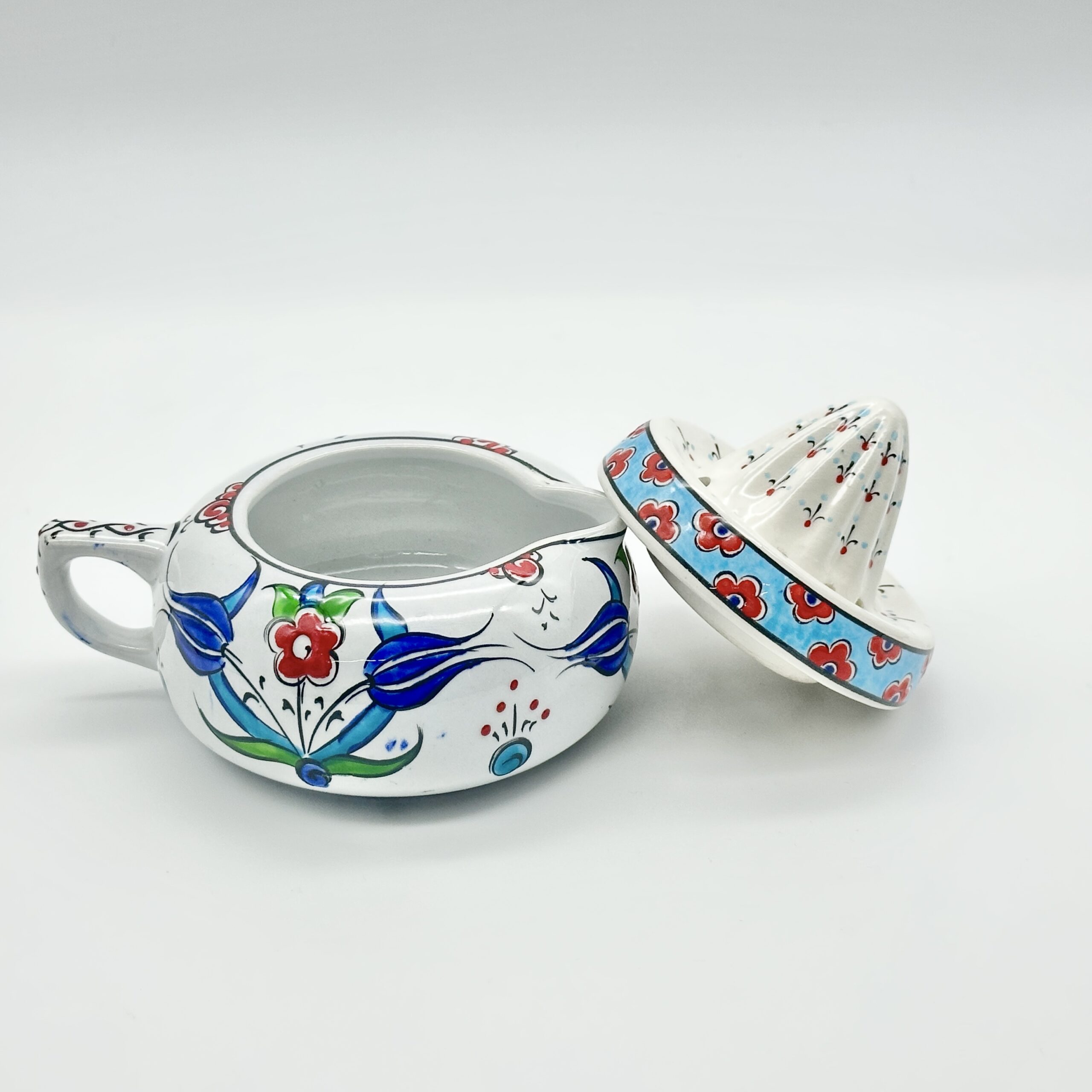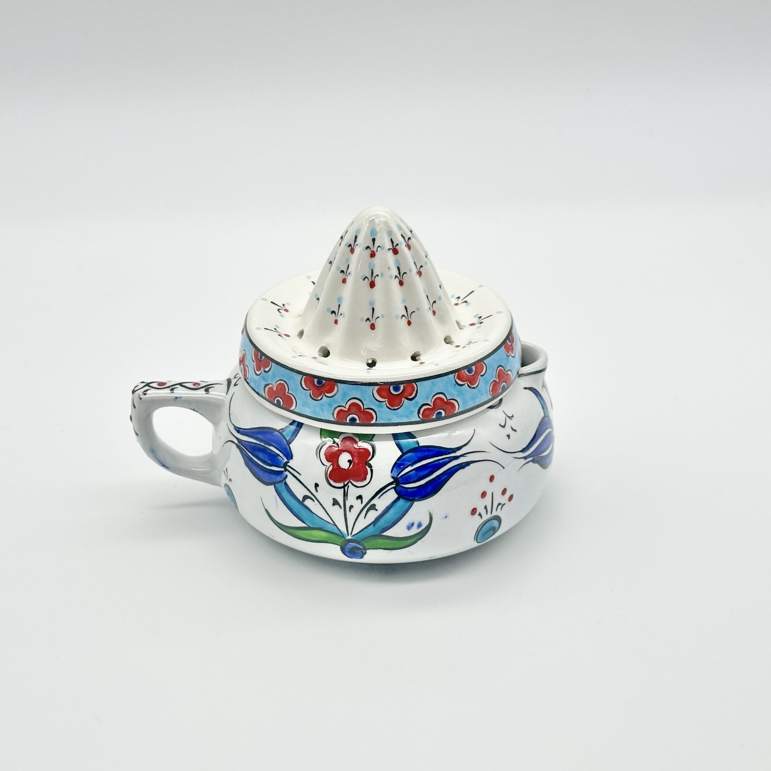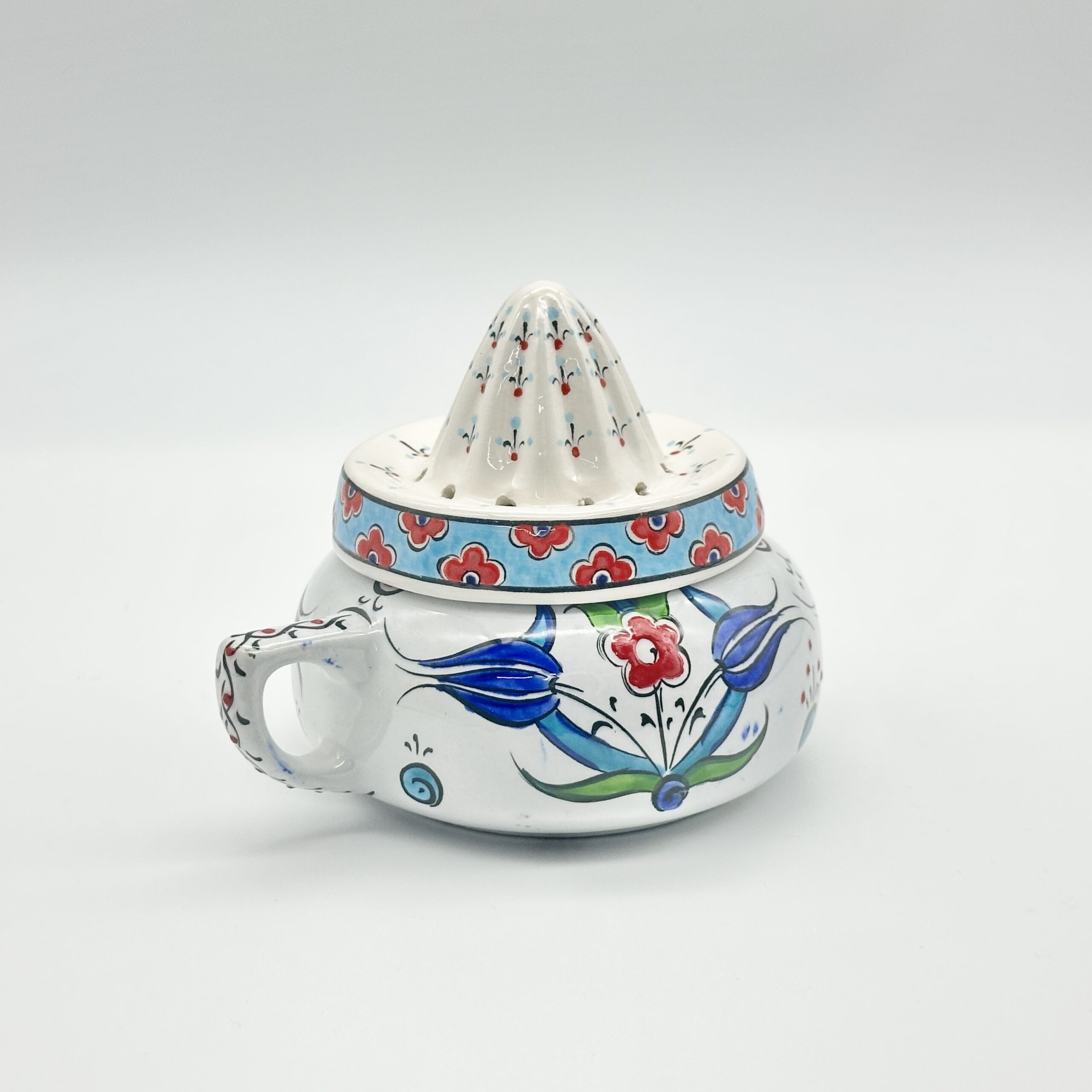 Handmade Ceramic Decorative Lemon Juicer Sculpture – Hand-Painted Iznik Tulips – Kitchen Shelf Decor Accent (Not Food Safe)
