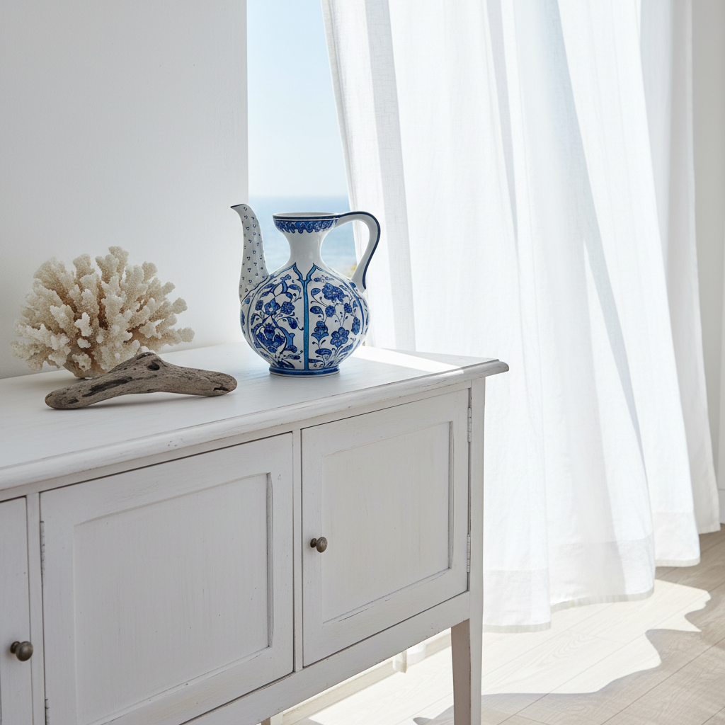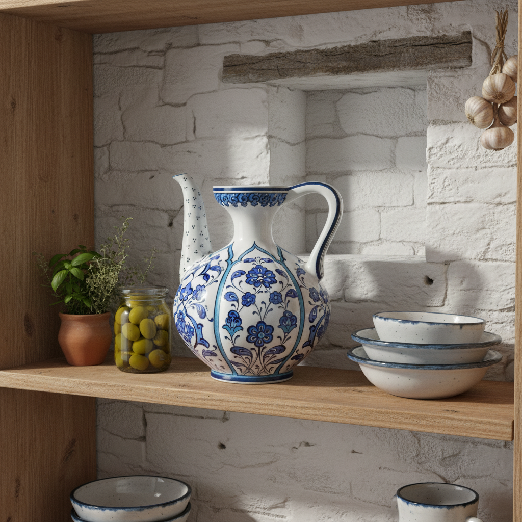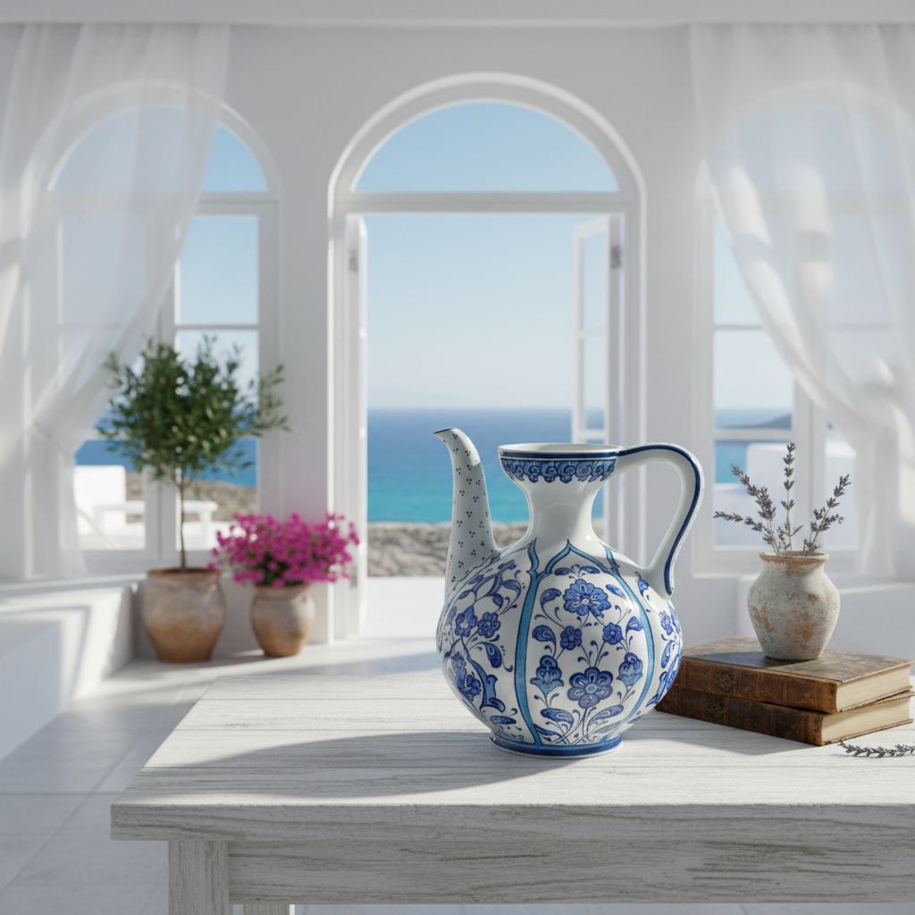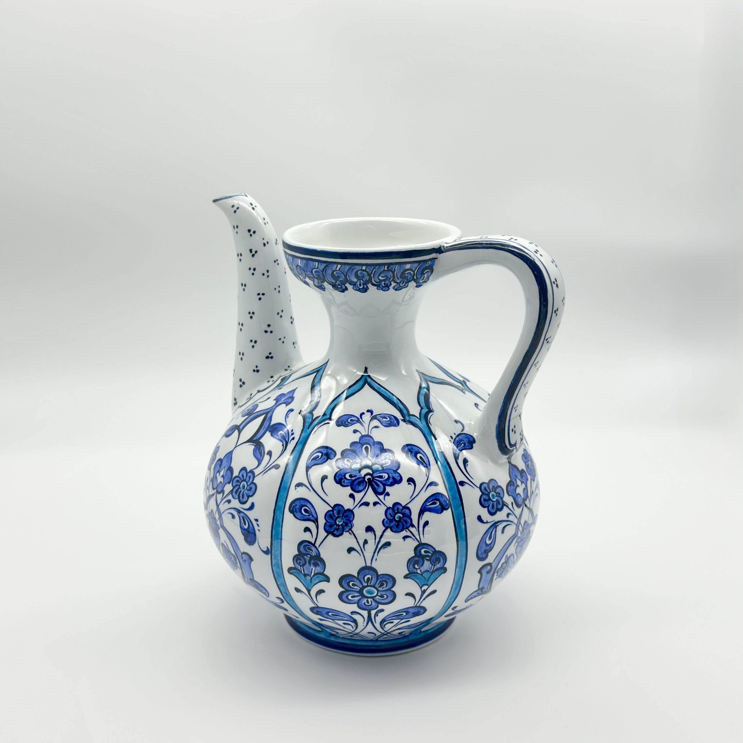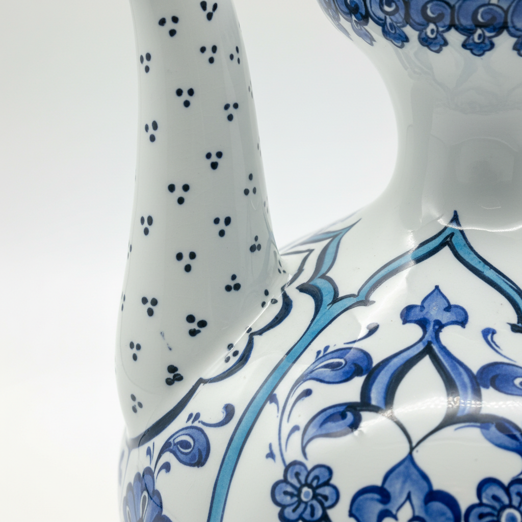 ⚠️ Uniqueness Guarantee: The spout is attached by hand, and the blue pigments are painted individually. The exact curve of the spout and the saturation of the blue glaze will vary slightly on every piece. This means your ewer is not just a copy, but a one of a kind original.