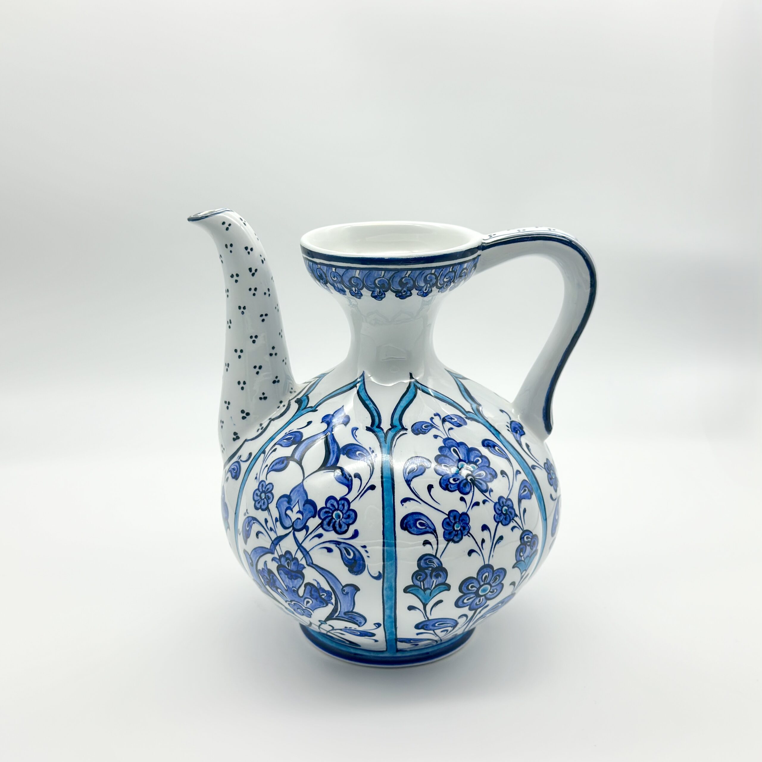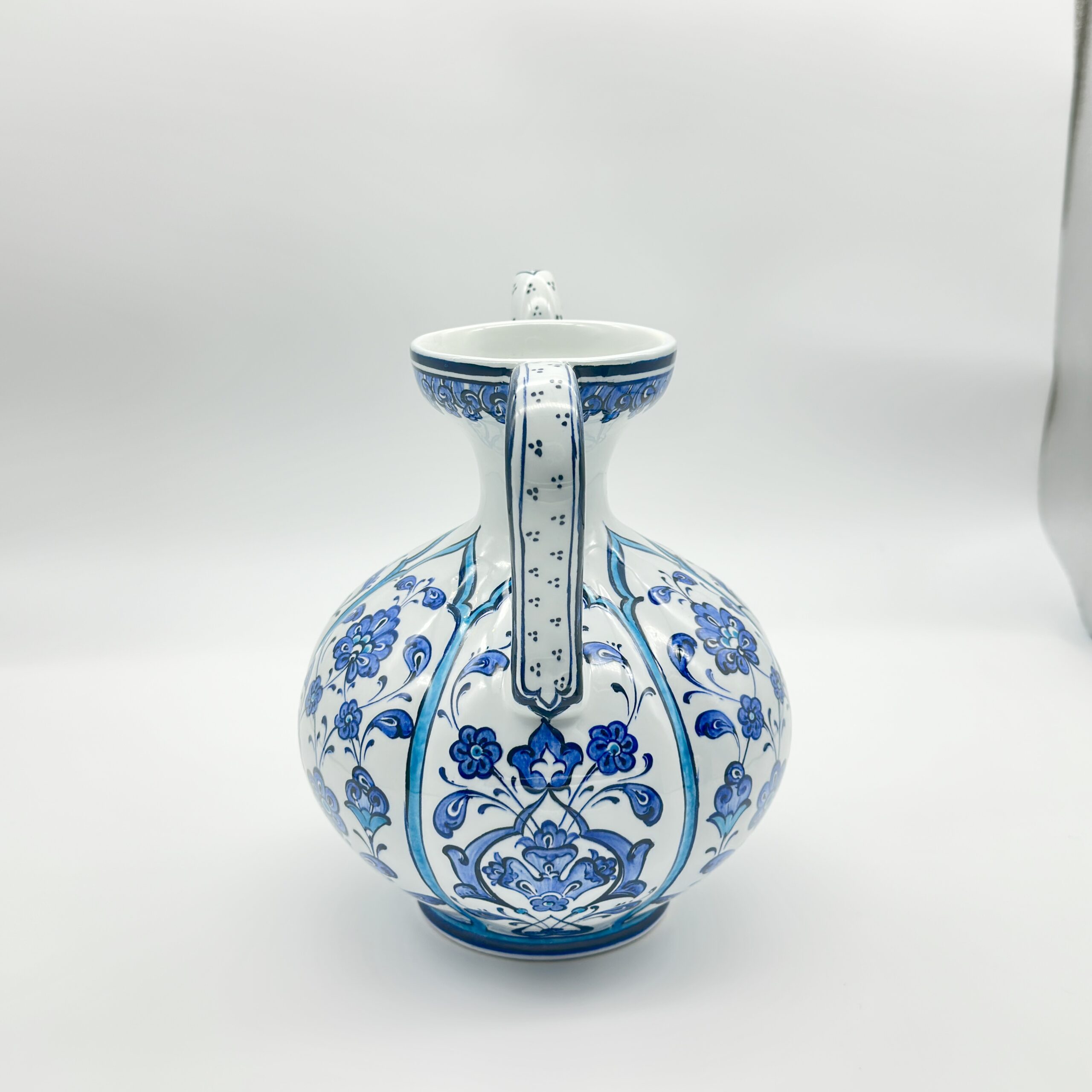 A Melody in Blue The design is a celebration of the classic Blue and White combination. The bulbous body is vertically segmented into panels, each filled with stylized Hatayi flowers and leaves. This “melon slice” arrangement gives the hard ceramic a soft and organic appearance.