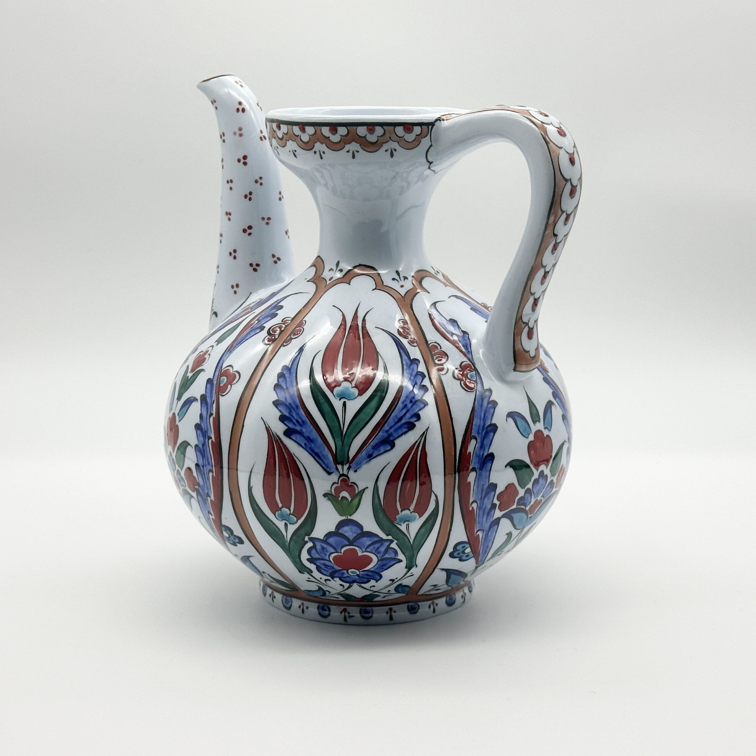 A masterpiece of structure. This 20cm handmade ceramic ewer features a unique segmented body, a graceful long spout, and intricate hand-painted tulip motifs.