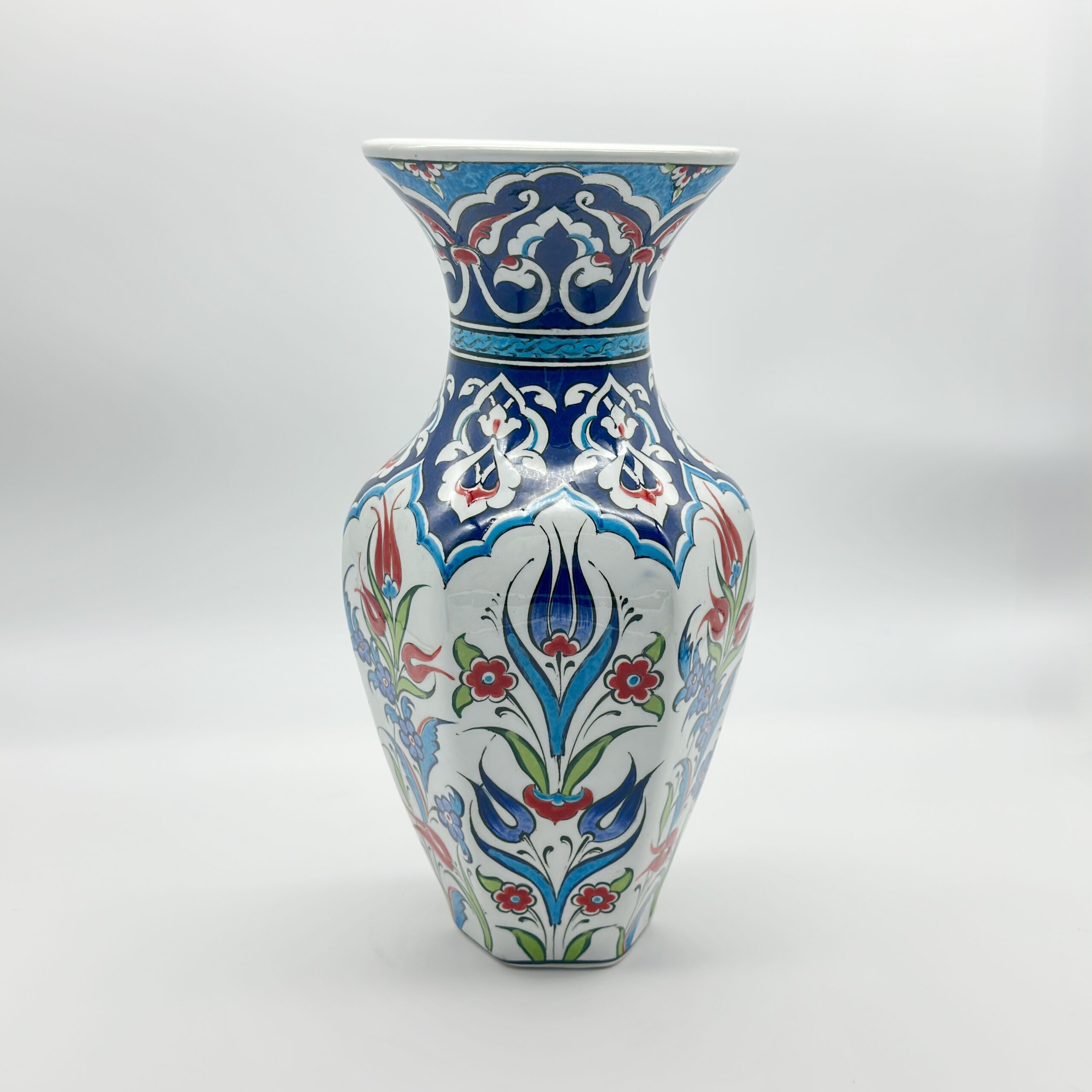 Handmade Ceramic Vase (25cm) Traditional Turkish Floral Art – Faceted Hexagonal Body with Cobalt Blue Rumi Motifs