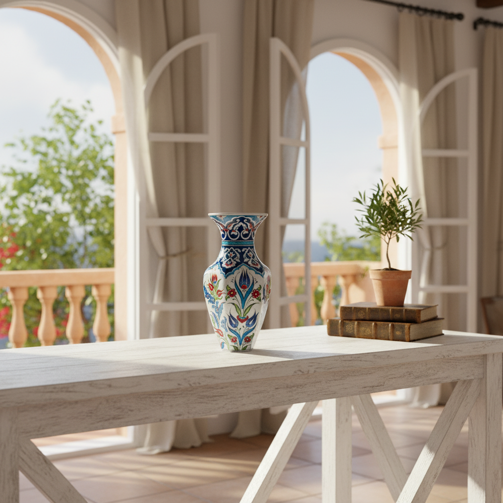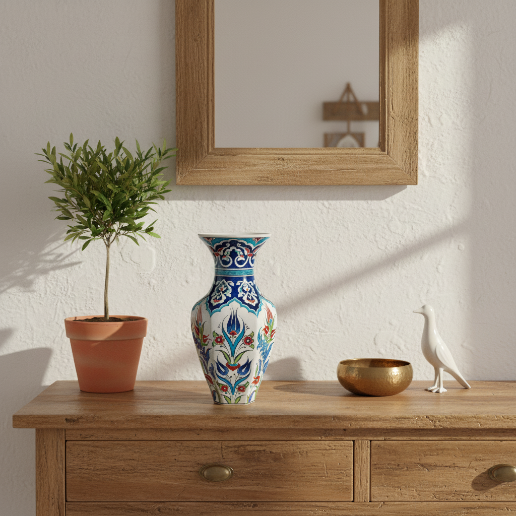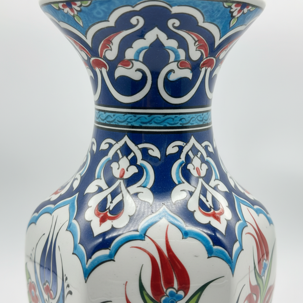 A Crown of Blue The most captivating feature is the neck. Painted in a rich Cobalt Blue, it is adorned with white “Rumi” scrolls and cloud motifs. This style, often found on the kaftans of Sultans, gives the vase a regal and sophisticated appearance.