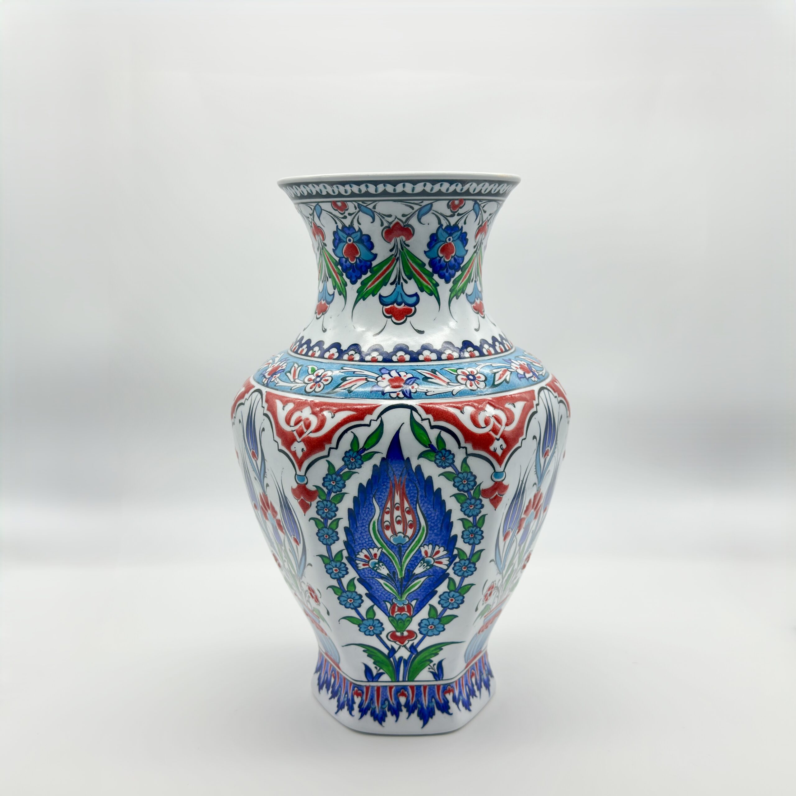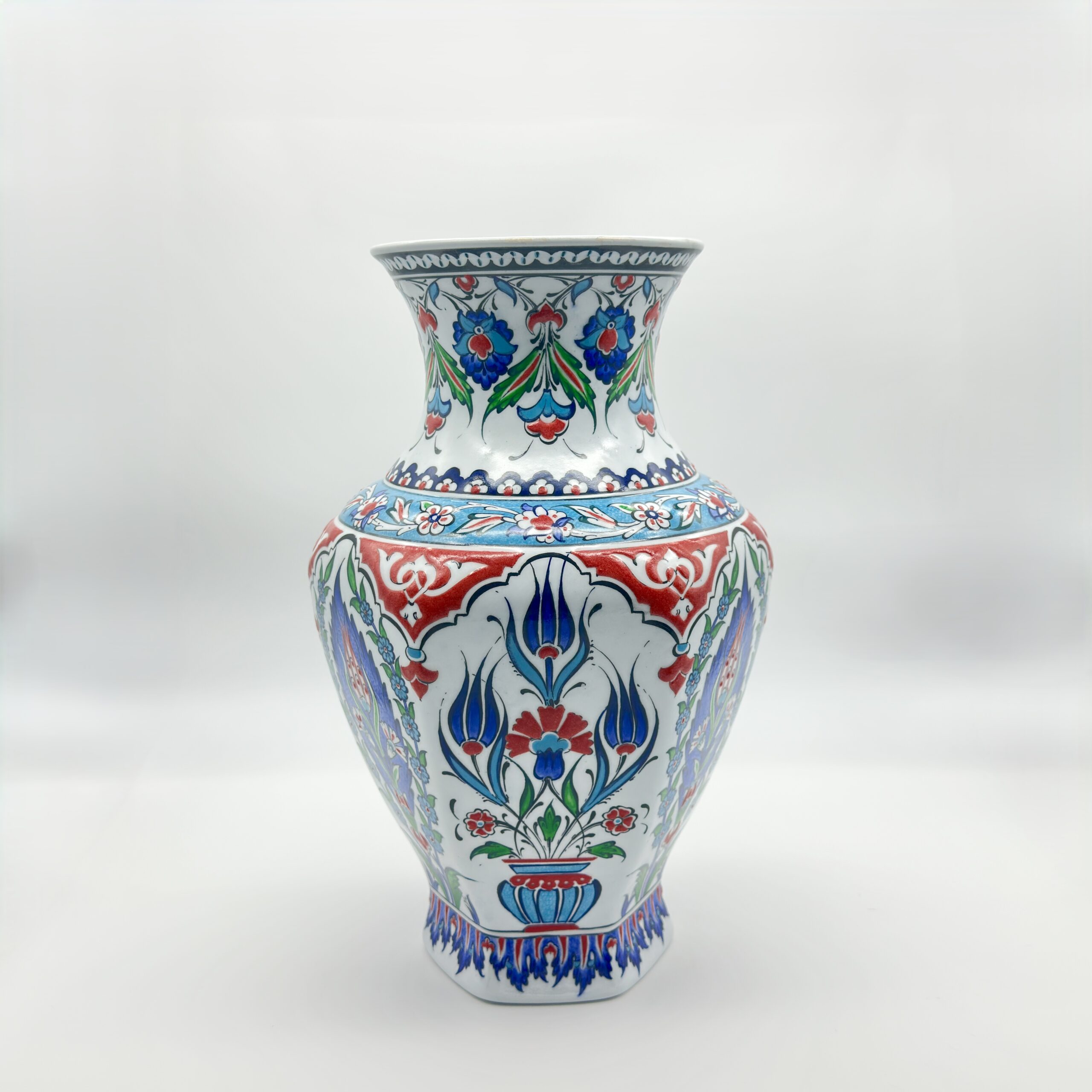 A gem of structure. This 30cm handmade vase features a rare faceted (angular) form, presenting classic Iznik cypress and tulip motifs on distinct flat panels like a work of architectural art.