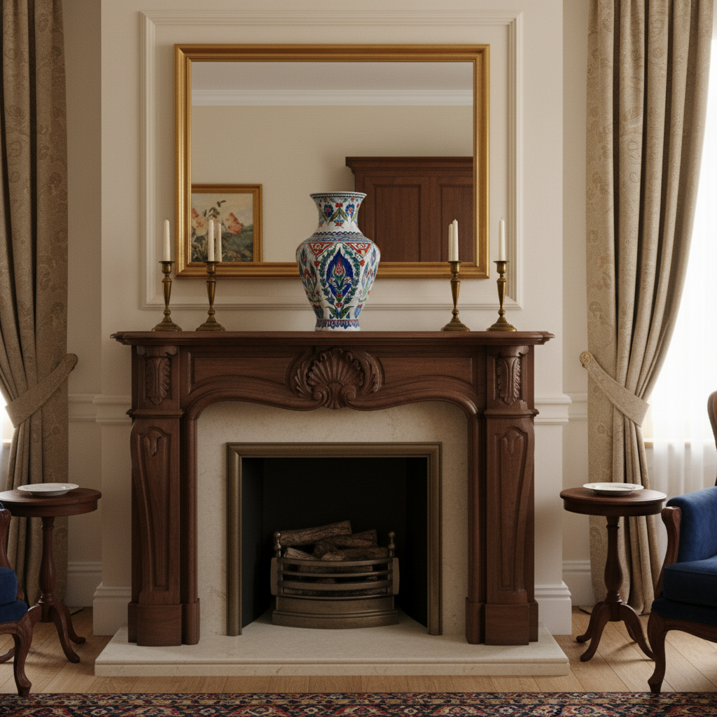 A Canvas of Panels The faceted shape creates individual panels, and the artist has treated the central panel as a framed canvas. Here, a magnificent Blue Cypress Tree rises, acting as a vessel for blooming Red Tulips. This “pattern within a pattern” is a hallmark of high end Iznik artistry, representing the “Tree of Life” bursting with energy.