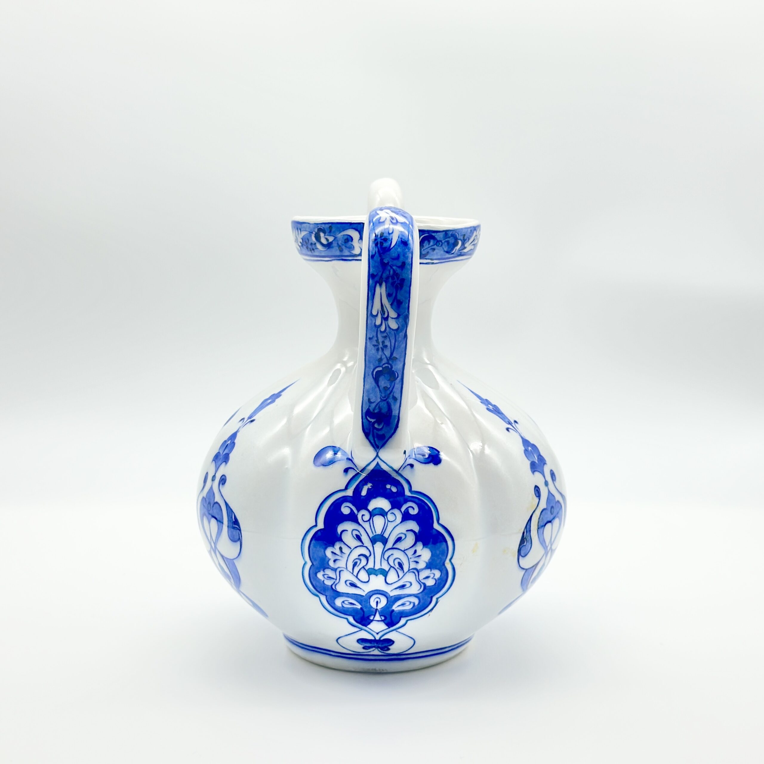 Vintage charm. This 20cm handmade ceramic ewer features a unique fluted body, an elegant handle, and traditional blue motifs on a pristine white background.