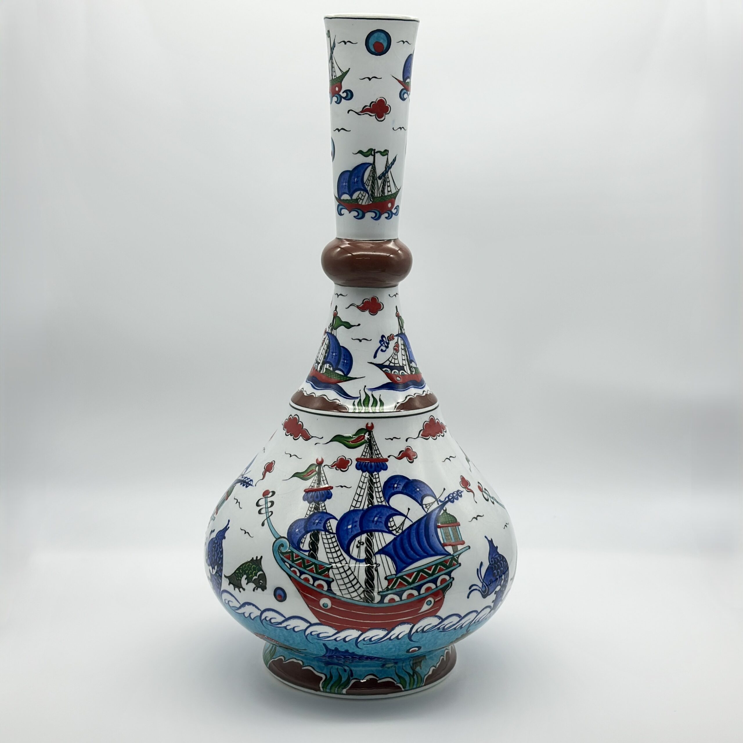 A voyage of meaning. This impressive 45cm vase features majestic Ottoman galleons and swimming fish, symbolizing the journey of life, resilience, and eternal abundance.