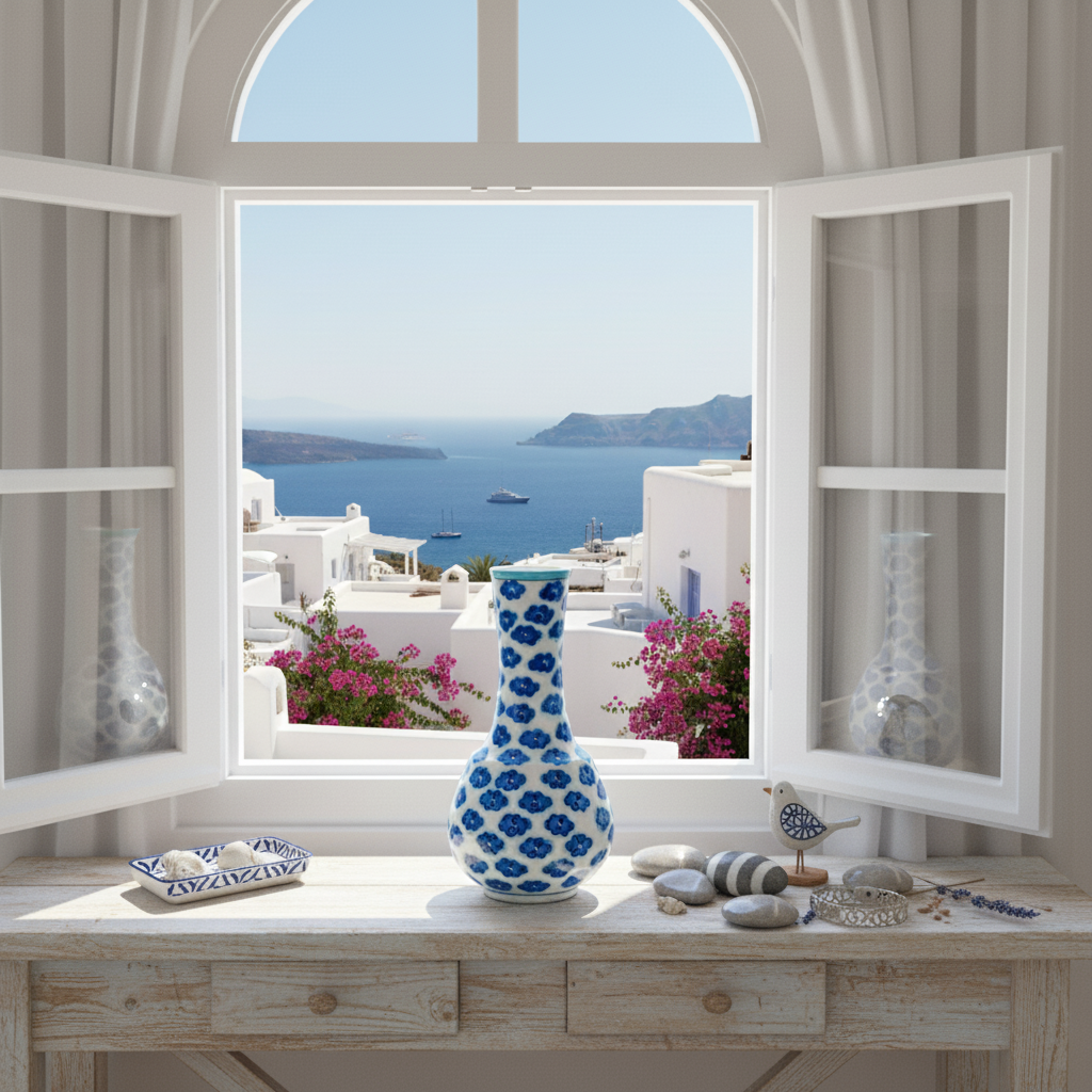 A breath of Aegean air. This 25cm handmade ceramic bud vase features a whimsical blue “Floating Cloud” pattern on a pristine white form, perfect for displaying elegant single stems.