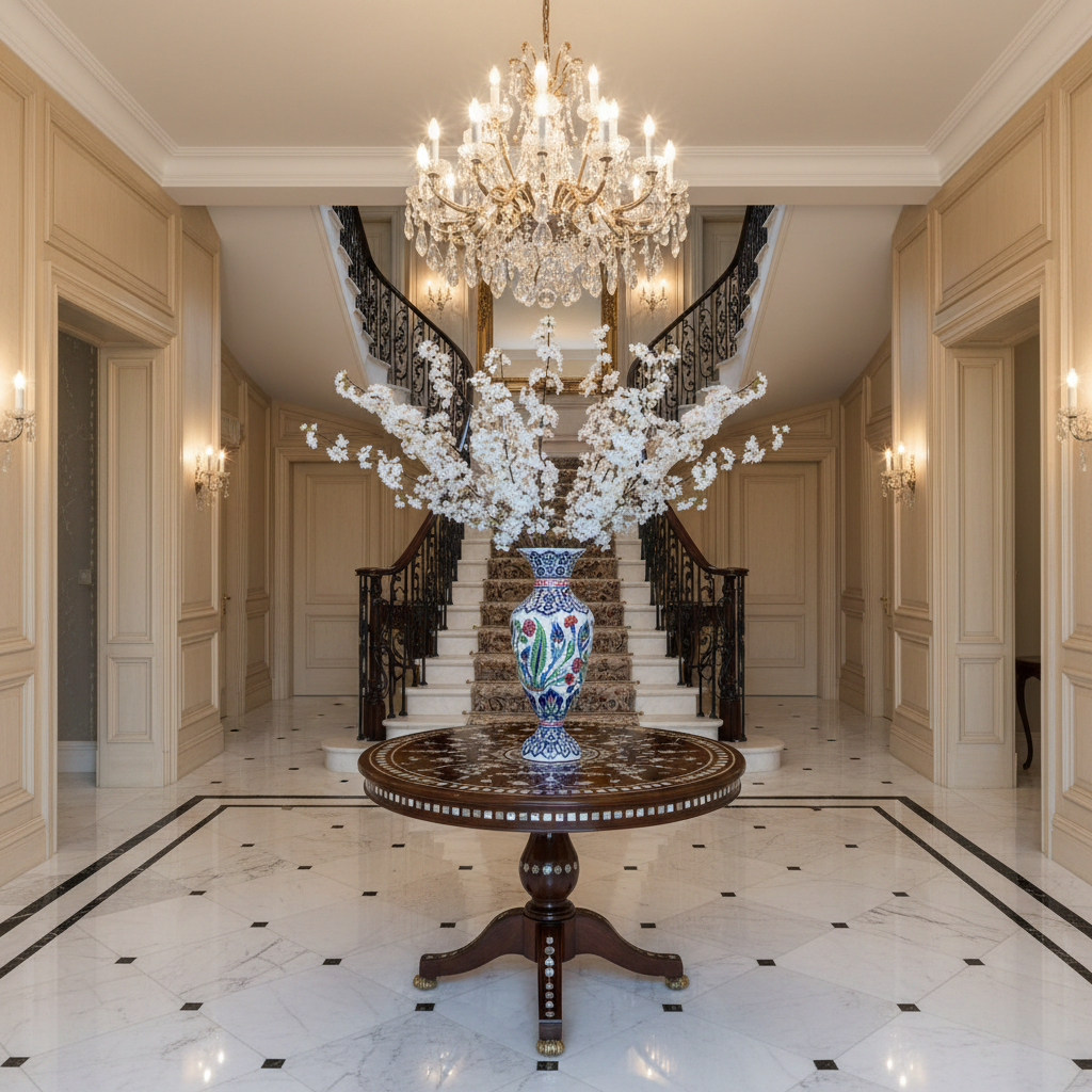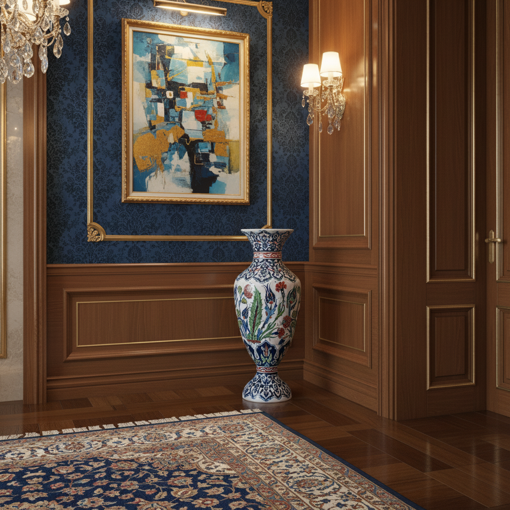 ⚠️ Uniqueness Guarantee: Firing a piece of this magnitude is an art form in itself. The saturation of the cobalt blue and the precise lines of the Rumi motifs will vary slightly on every vase. This ensures that your Grand Palace Vase is a one of a kind original masterpiece.