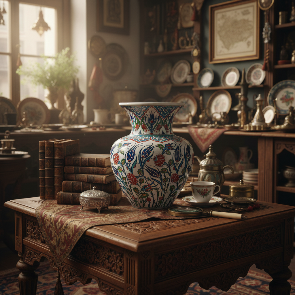 A monument to tradition. This massive 50cm handmade ceramic vase features a grand, open silhouette, densely hand-painted with museum-quality Iznik blue and white motifs.