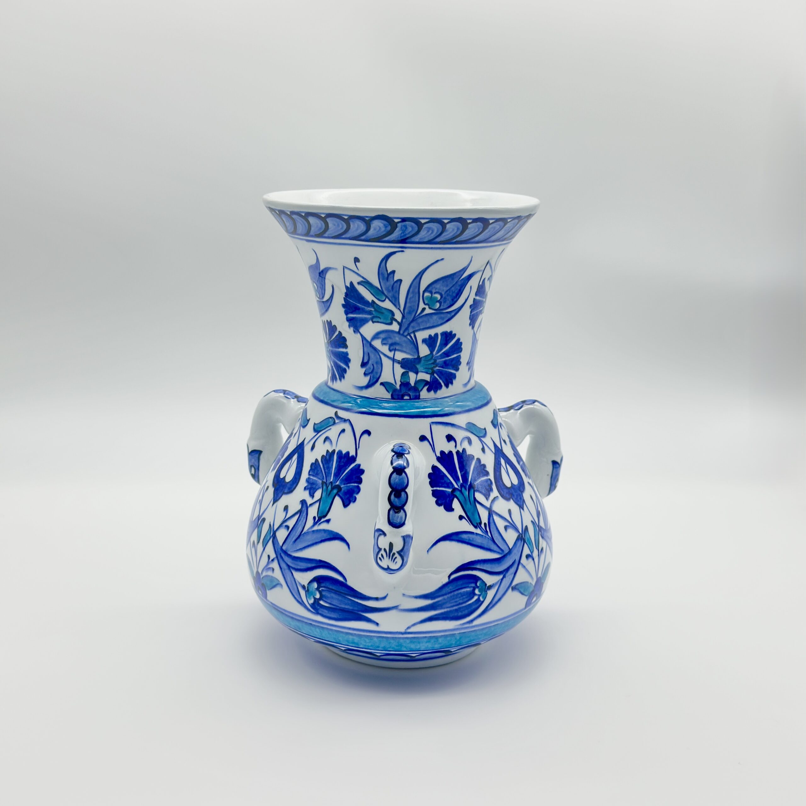 A calm classic. This 20cm handmade ceramic vase features the historic triple handled kandil silhouette in a compact size, decorated with elegant blue and white floral motifs.