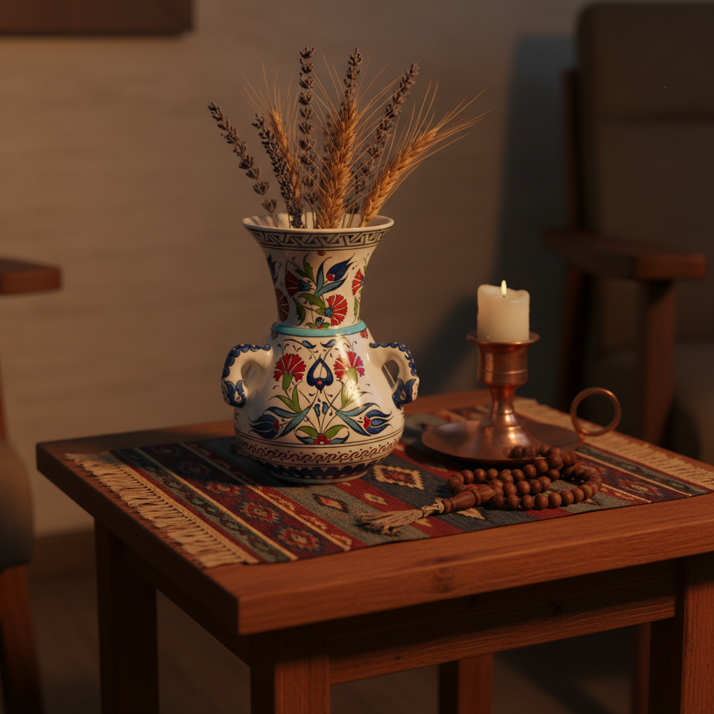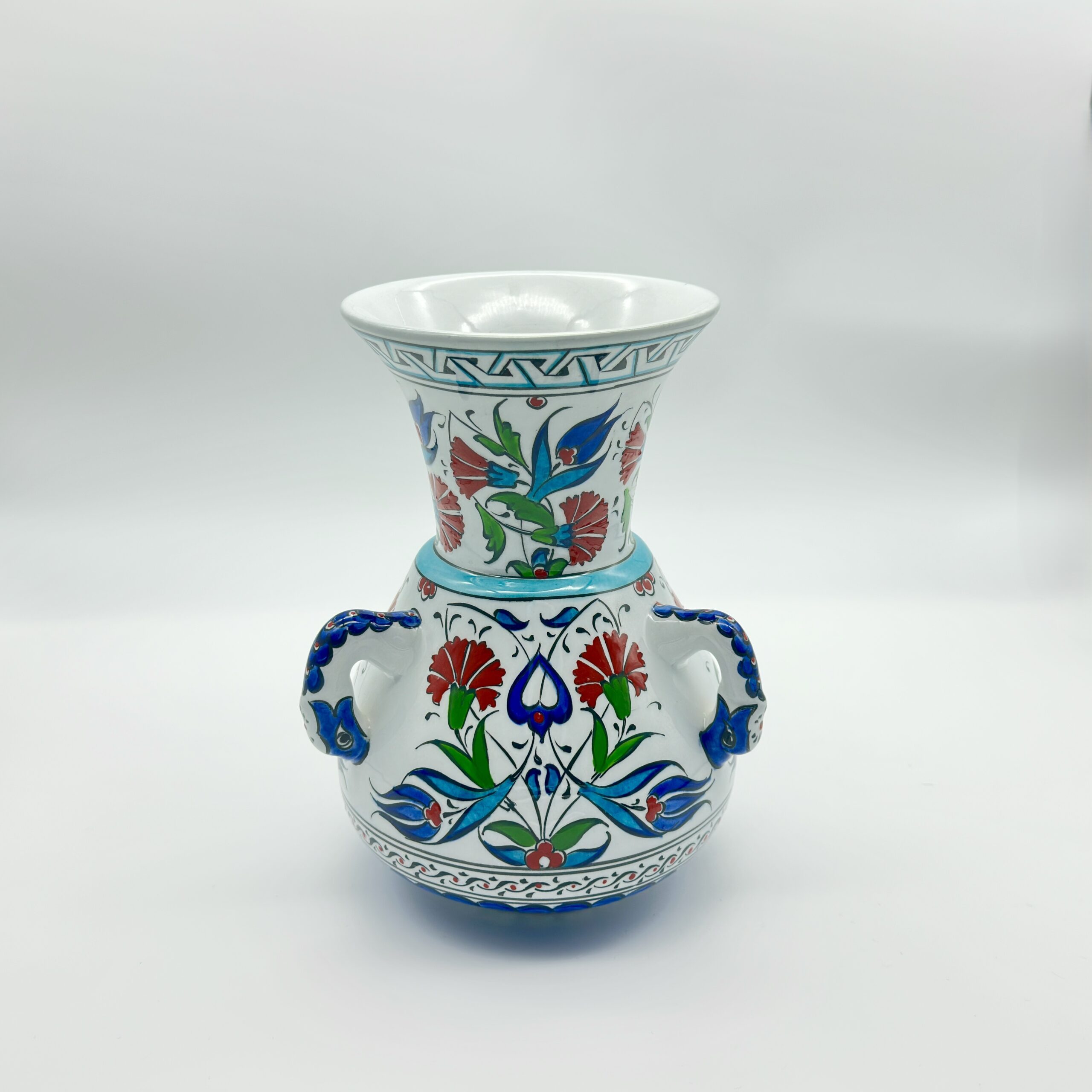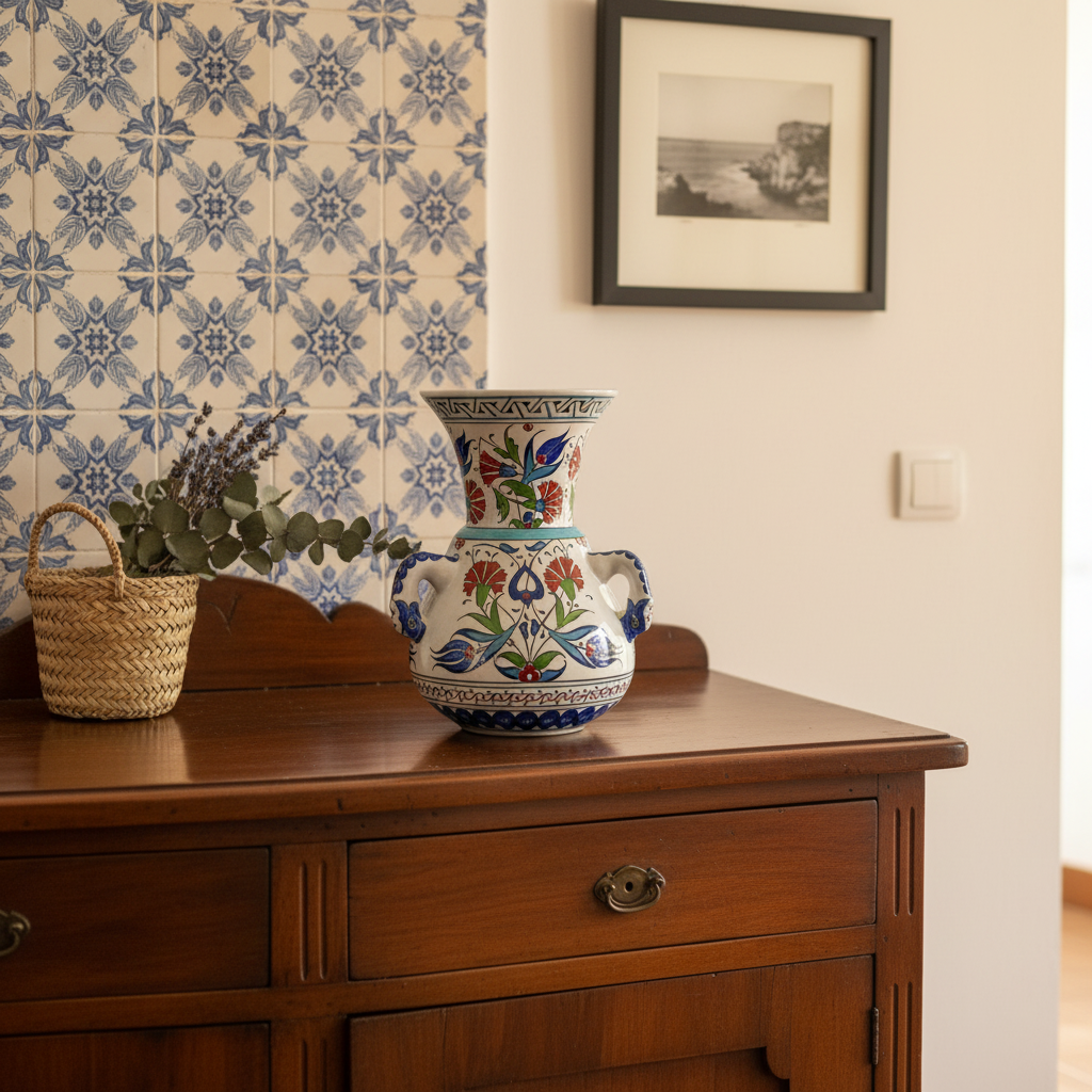 This Handmade Ceramic Vase brings a piece of architectural history into your home. Modeled after the famous “Kandil” (Mosque Lamps) of the classic Ottoman era, this 20 cm vessel stands out with its distinctive handled form.