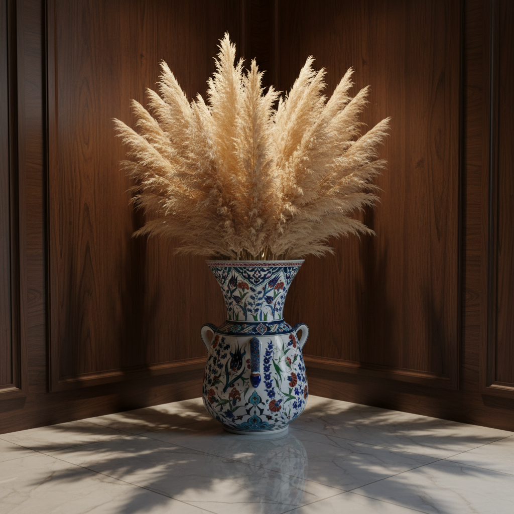 This Handmade Ceramic Kandil Vase is a masterclass in scale and versatility. Standing at 50 cm, it breaks the rules of standard pottery by being bold enough to claim its place on the floor.