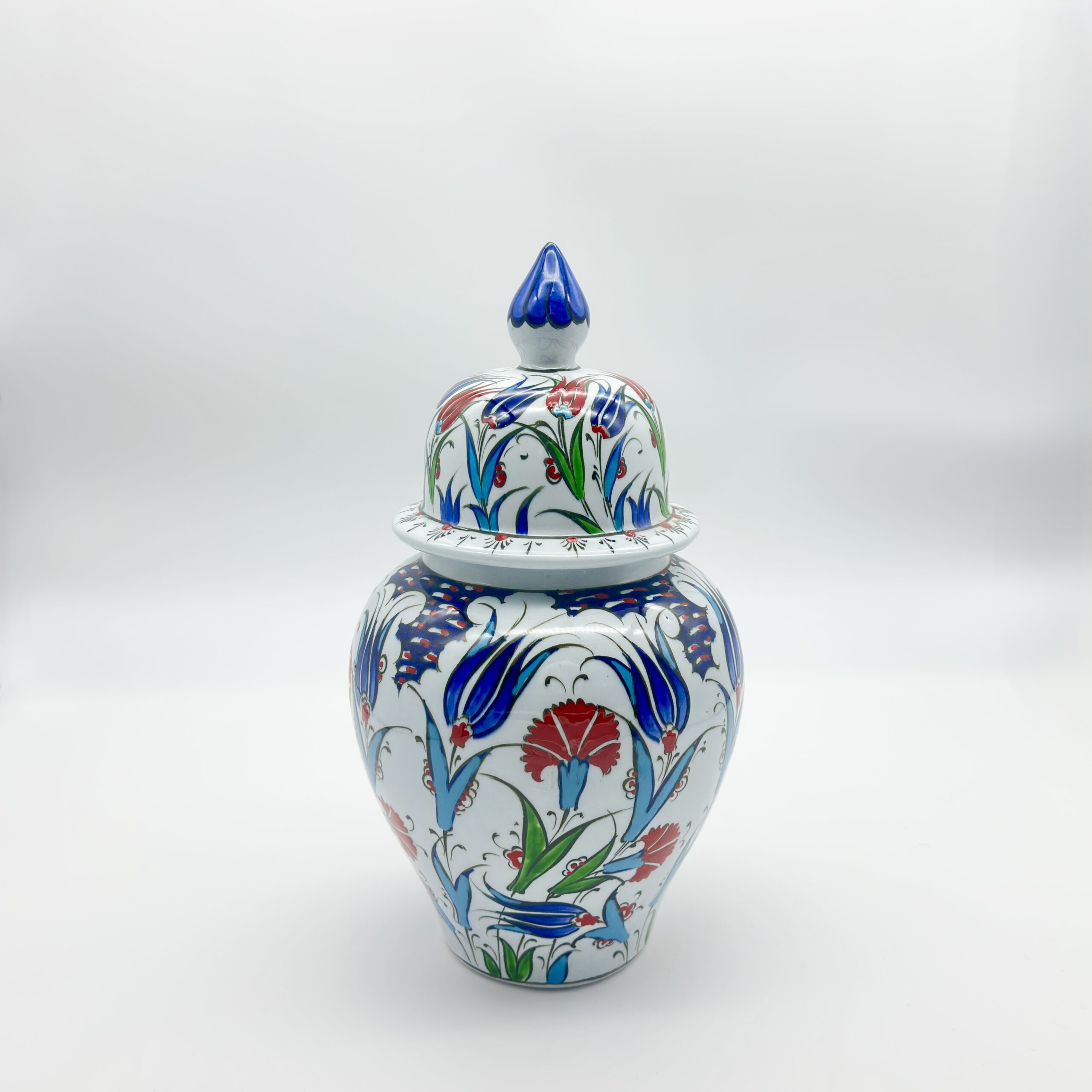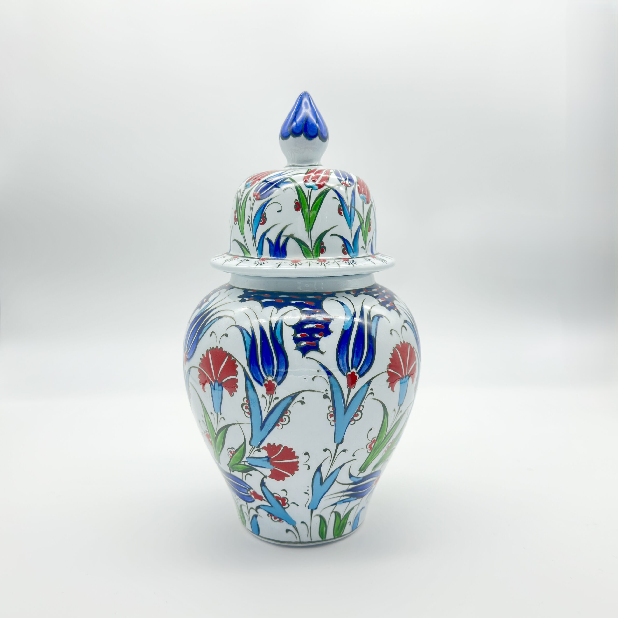 A Garden Under a Dome The artist has wrapped the jar in a classic Iznik garden. Crimson Tulips and Cobalt Blue Carnations rise from the base, their stems intertwining in harmony. The design is crowned by a domed lid, topped with a solid blue finial that acts as the perfect finishing touch.