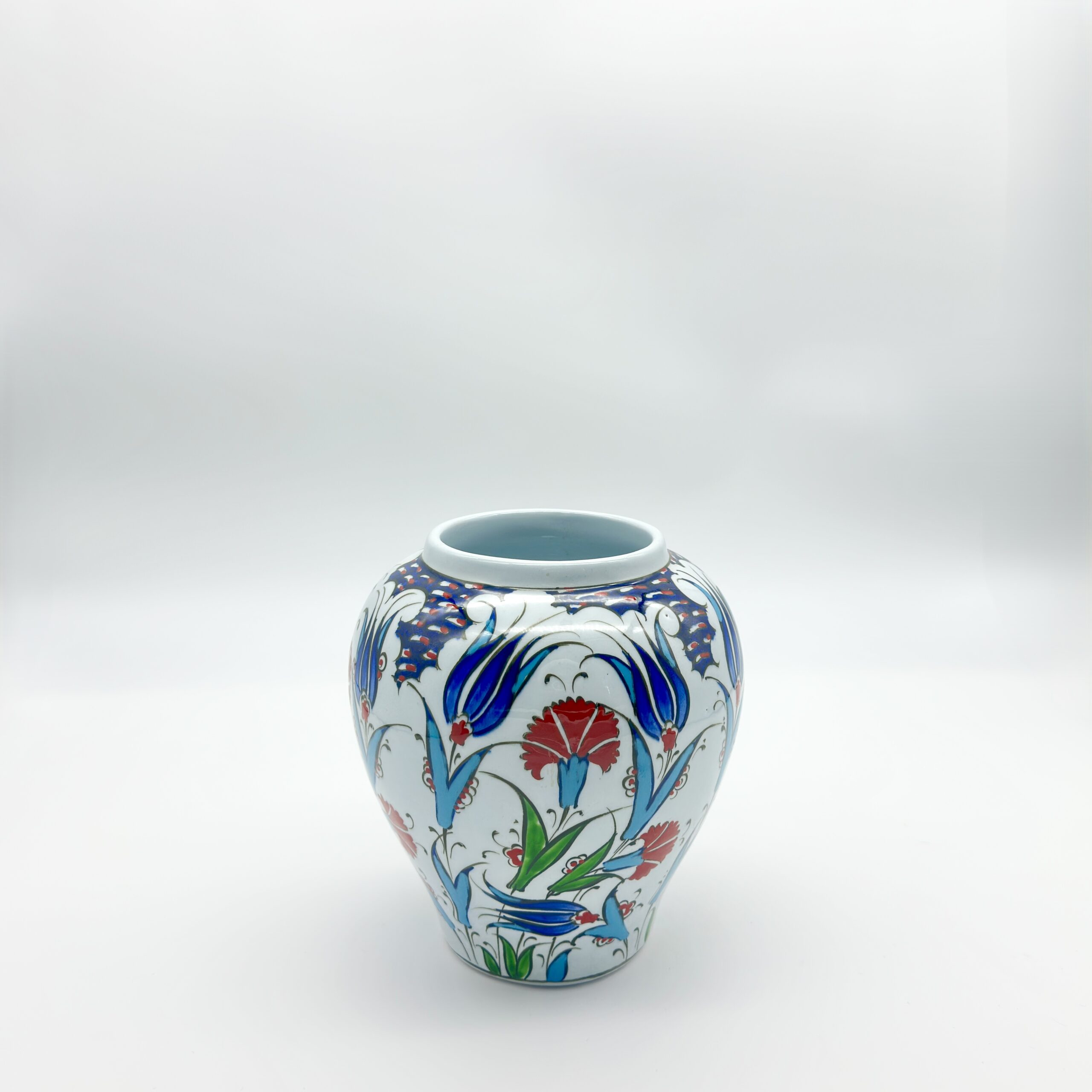 A gem of Ottoman tradition. This 20cm handmade ceramic “Kupecik” (Ginger Jar) features a removable lid and a vibrant garden of classic red tulips and blue carnations.