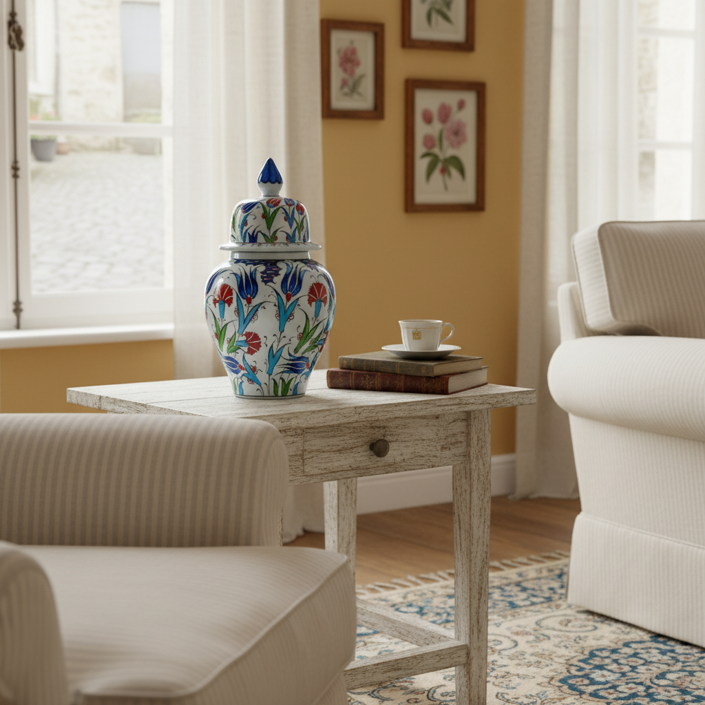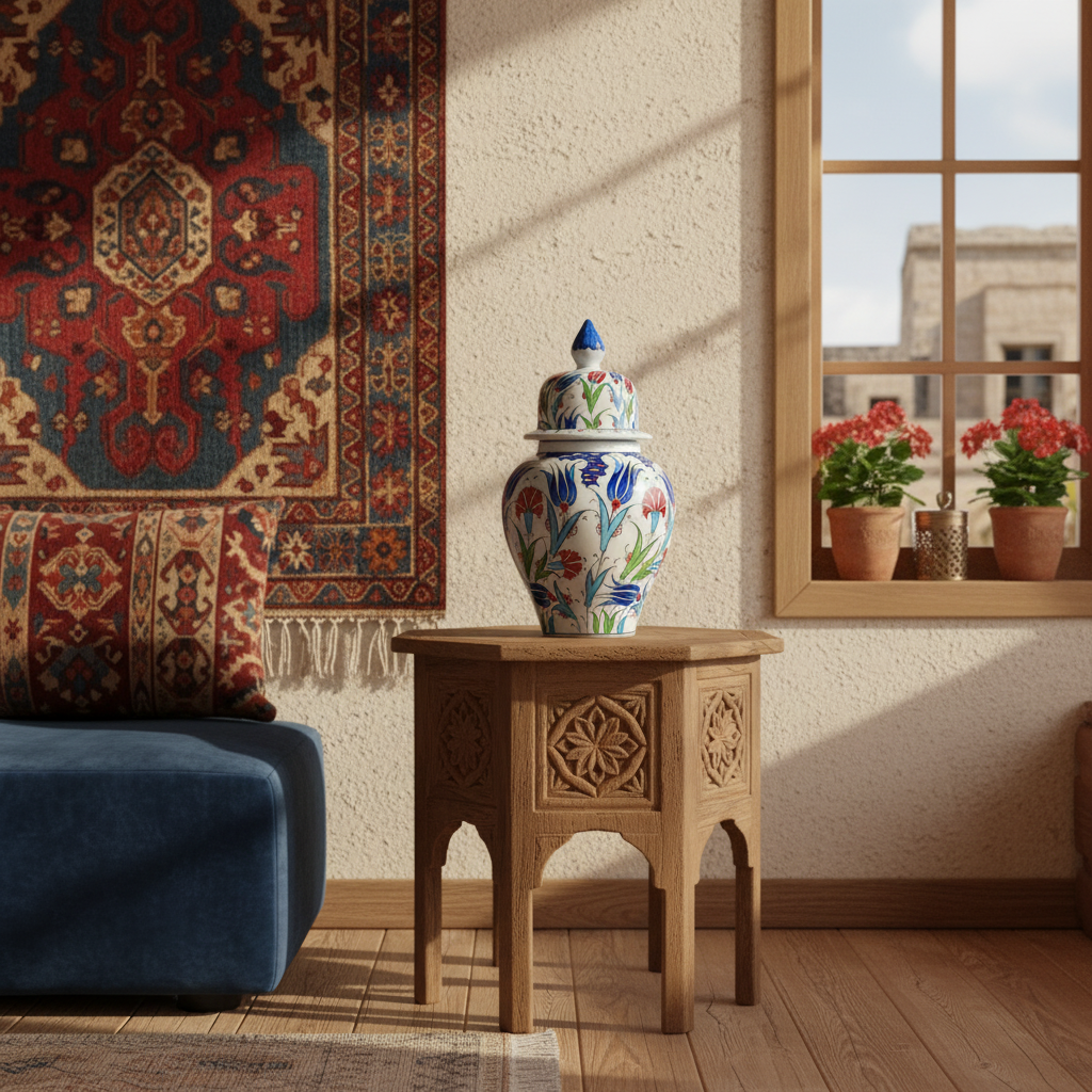 There is something undeniably charming about a lidded jar. This Handmade Ceramic “Kupecik” (Ginger Jar) combines the functionality of a vessel with the beauty of a sculpture. Standing at 20 cm, it is a concentrated burst of Ottoman artistry, designed to be a treasured accent in your home.
