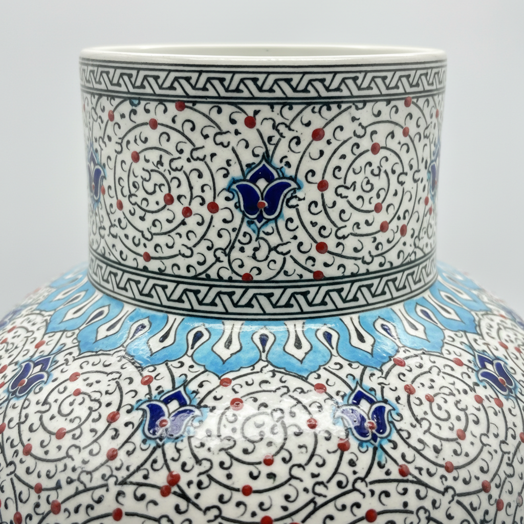 This 50cm Handmade Ceramic Iznik Halic Style Vase is a triumph of detail. It is a monumental piece that offers a visual experience that changes depending on how close you stand.