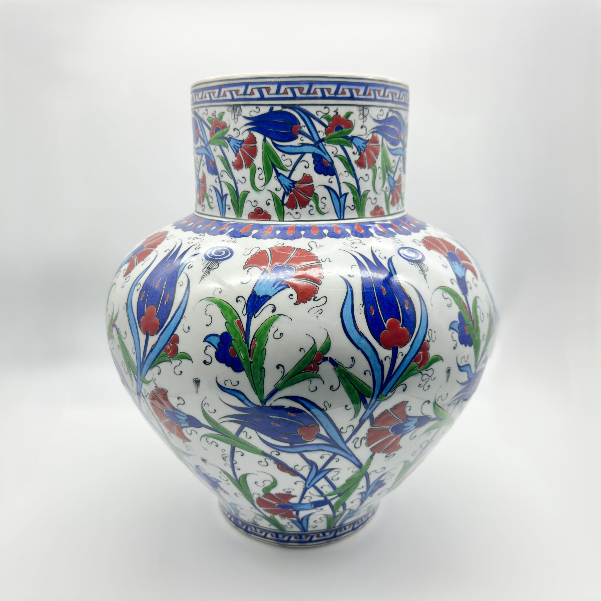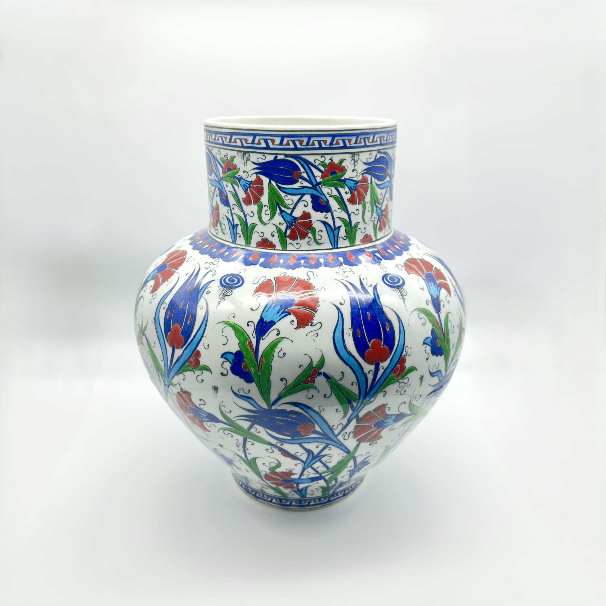 The Canvas of Clay Imagine the patience required to paint a surface this vast. The artist has treated the vase not as a container, but as a circular canvas. The brushwork breathes life into the Ottoman Tulips and Carnations, creating a sense of movement that leads the eye around the entire form. The separation between the geometric motifs on the neck and the organic garden on the body is a hallmark of classic 16th-century court art.