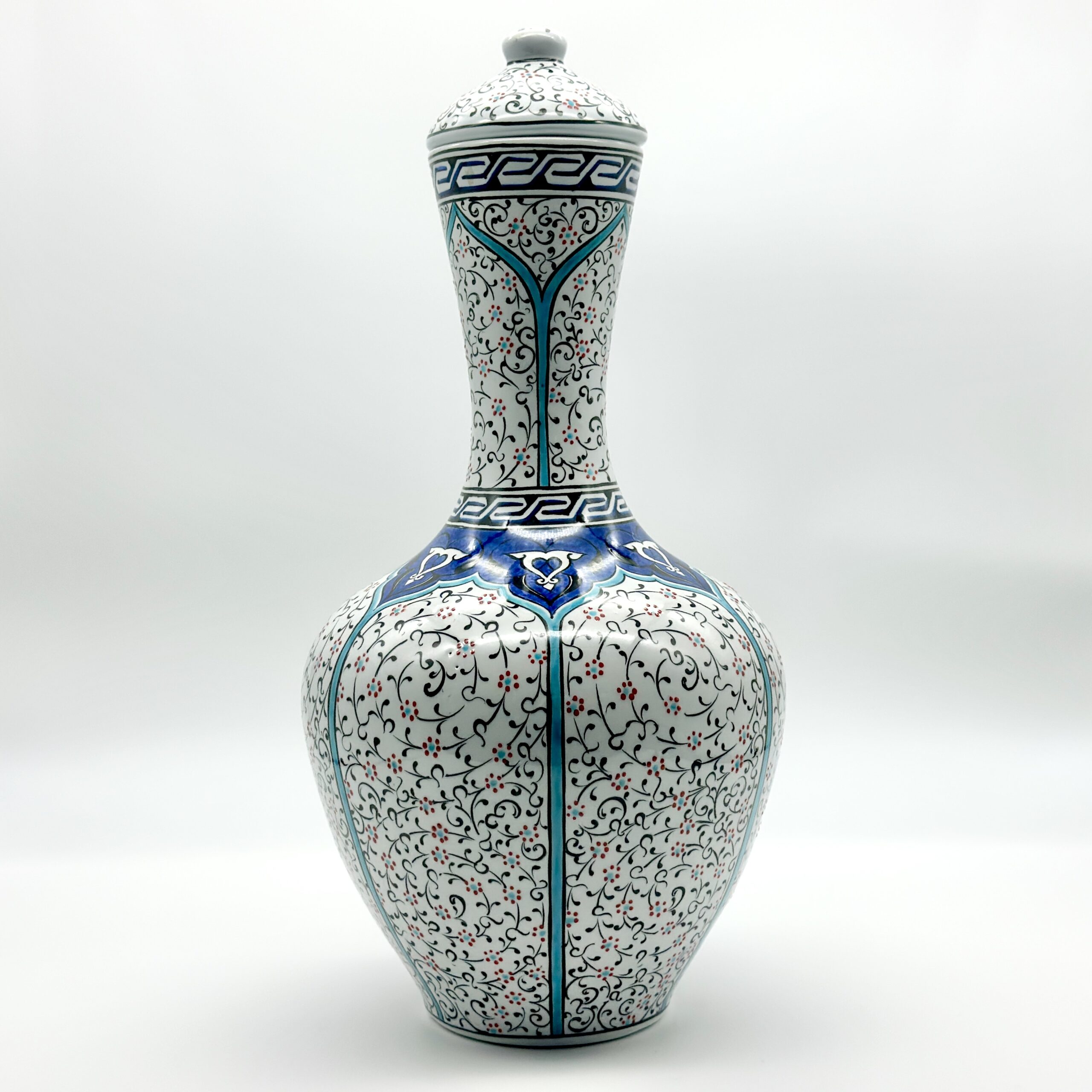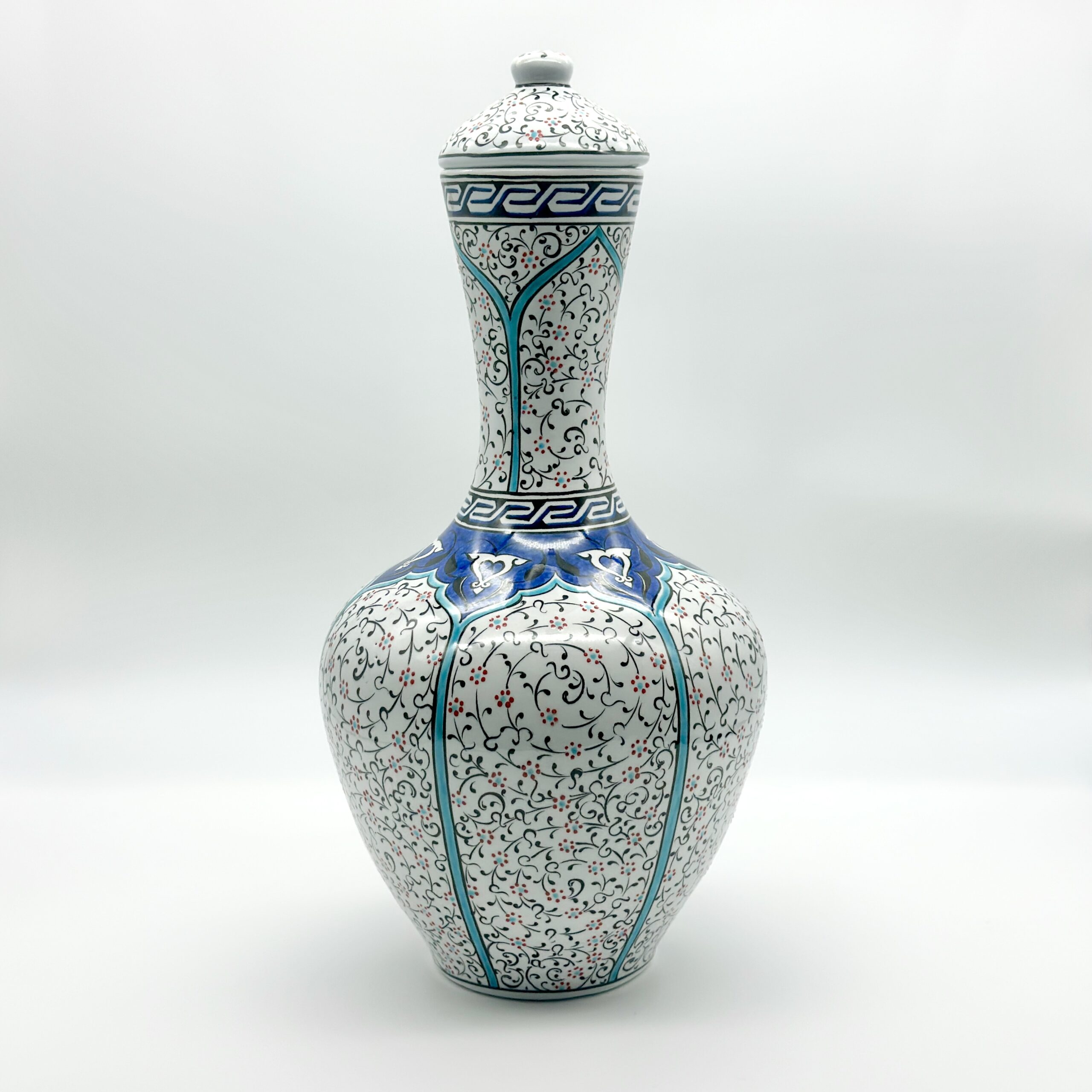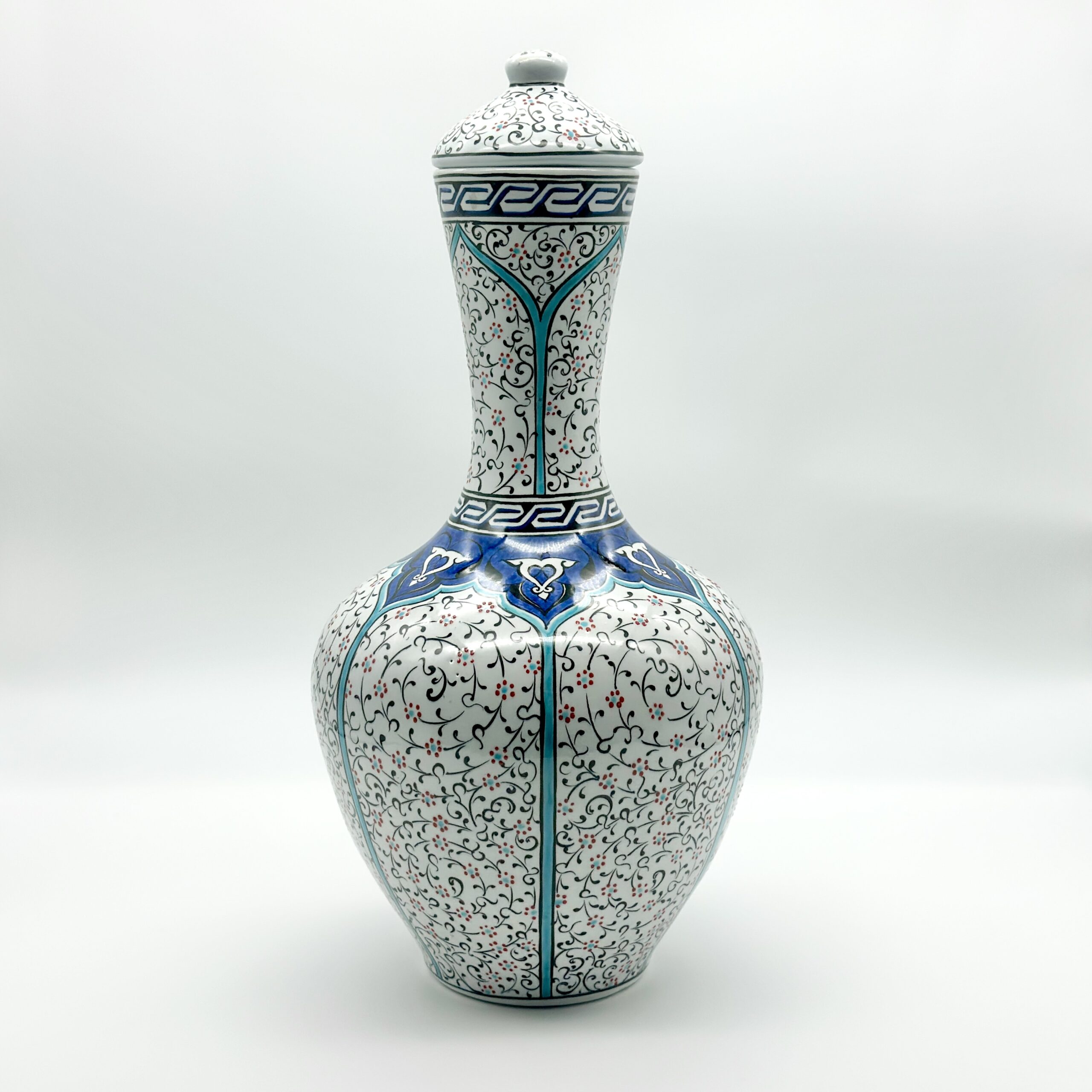 Handmade Ceramic Lidded Vase (30cm) Traditional Ottoman “Golden Horn” (Haliç) Style with Turquoise Bands – Decorative Art Object
