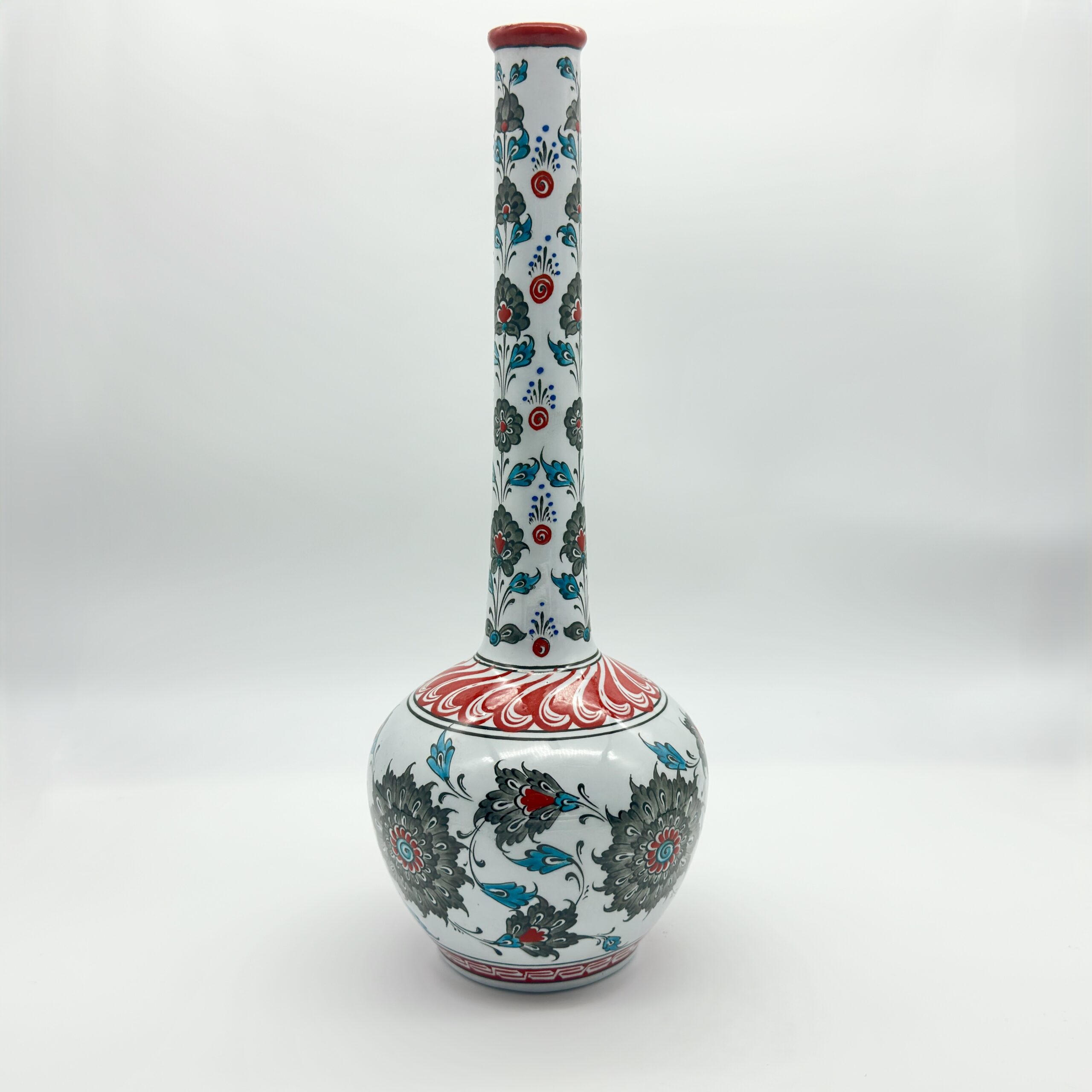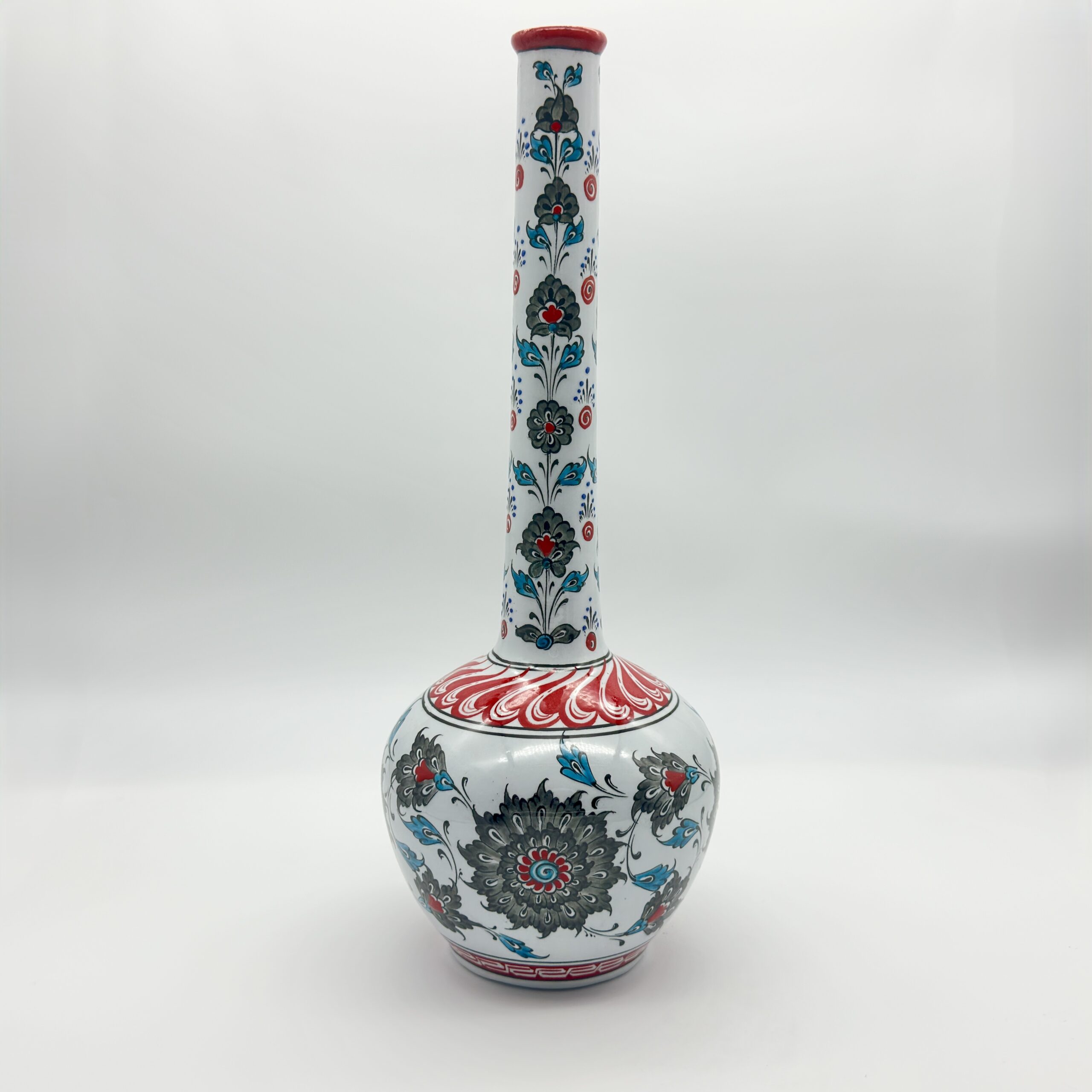 Handmade Ceramic Tall Vase (45cm) Elegant “Ringed Neck” Design with Red Tulip & Blue Floral Pattern – Grand Console Decor
