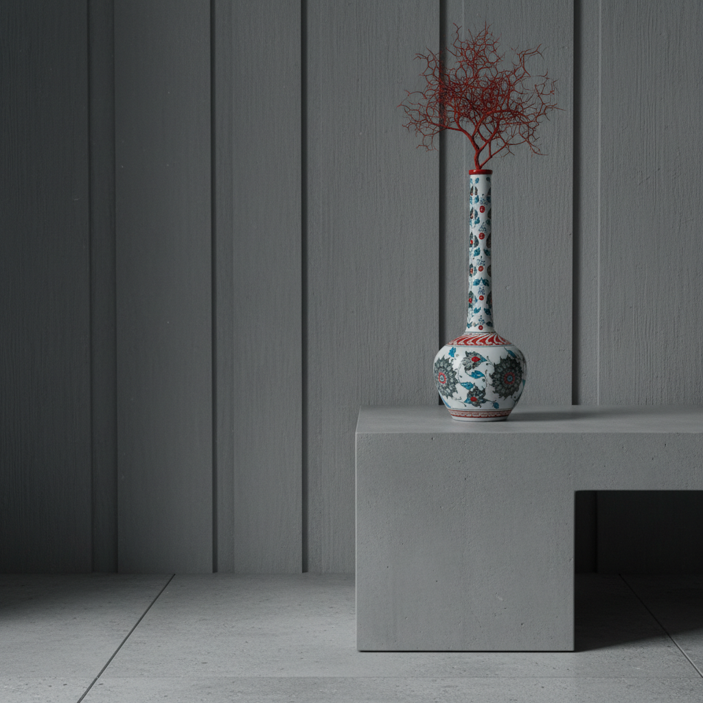 Architectural Balance The vase is grounded by a red geometric band at the base, which visually balances the red details on the neck. It is a piece that looks just as stunning empty as it does holding a single long stemmed flower.