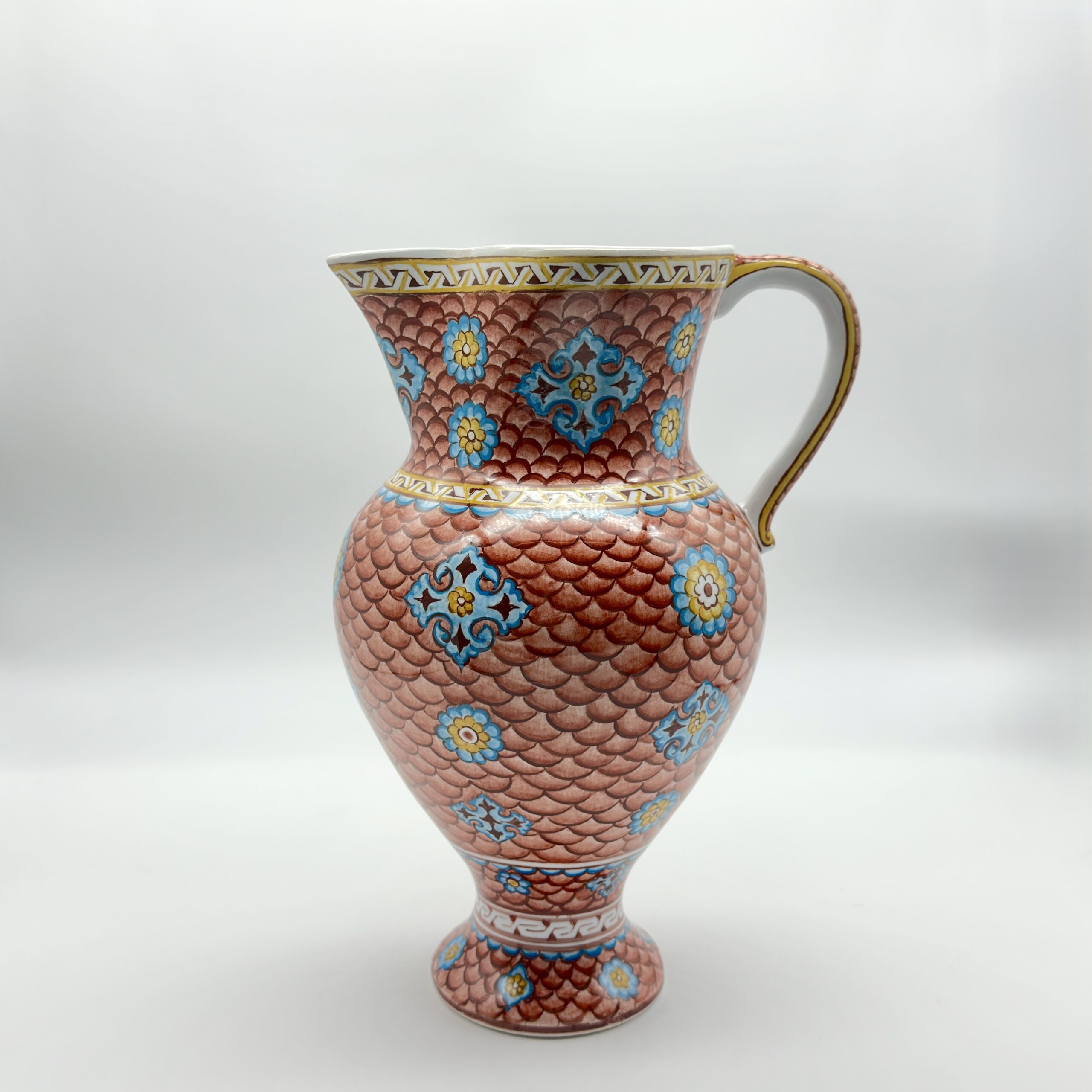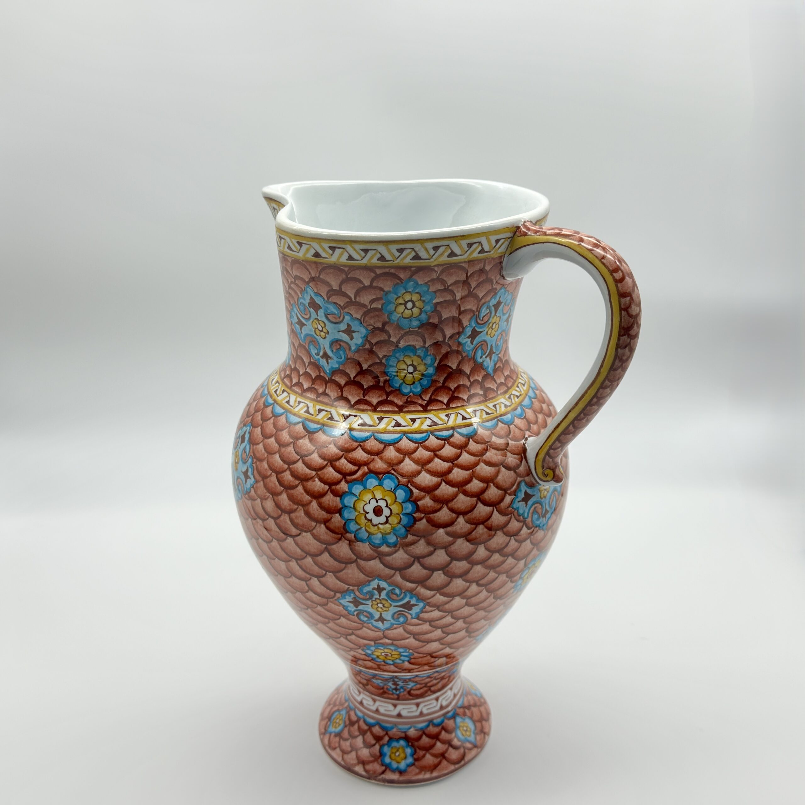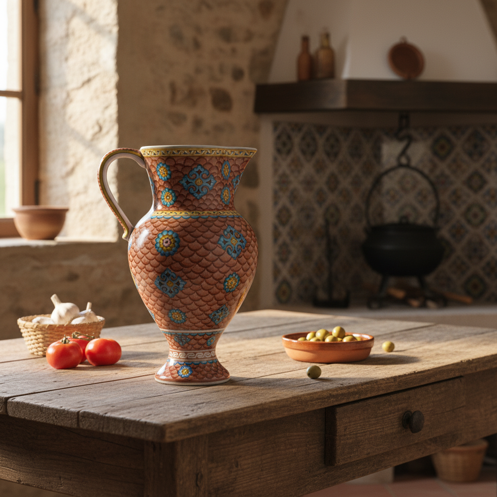⚠️ Uniqueness Guarantee: The scales are painted one by one in a repetitive, meditative process. The saturation of the terracotta glaze and the placement of the blue medallions will vary slightly, ensuring your pitcher is a unique work of artisan craft.