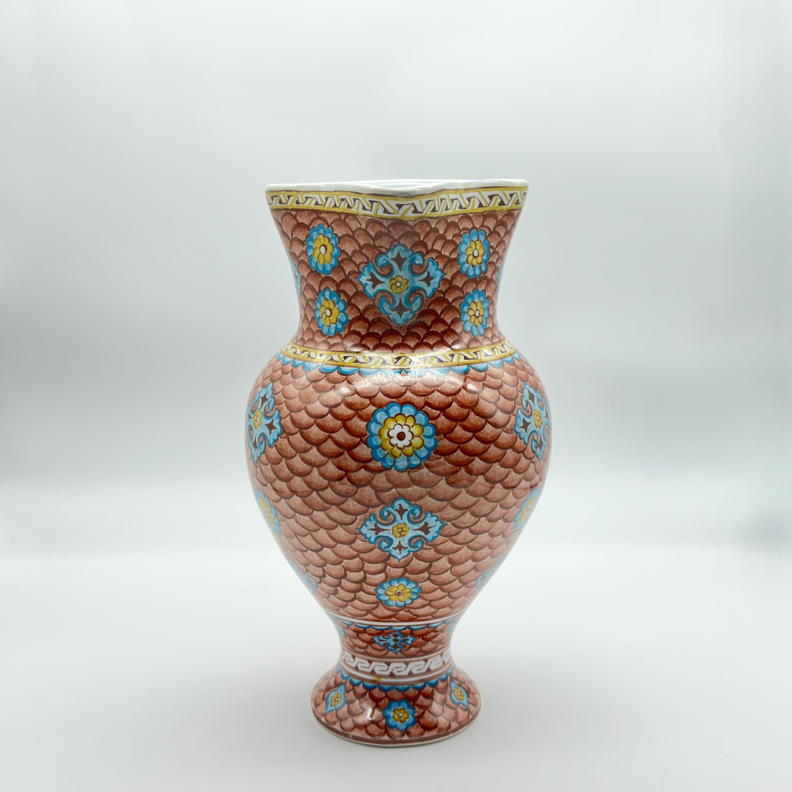 This Handmade Ceramic Pitcher offers a warm, rustic twist on the classic Iznik tradition. Standing at 25 cm, it features the hypnotic ”Fish Scale” pattern, executed in a rare and inviting terracotta palette.
