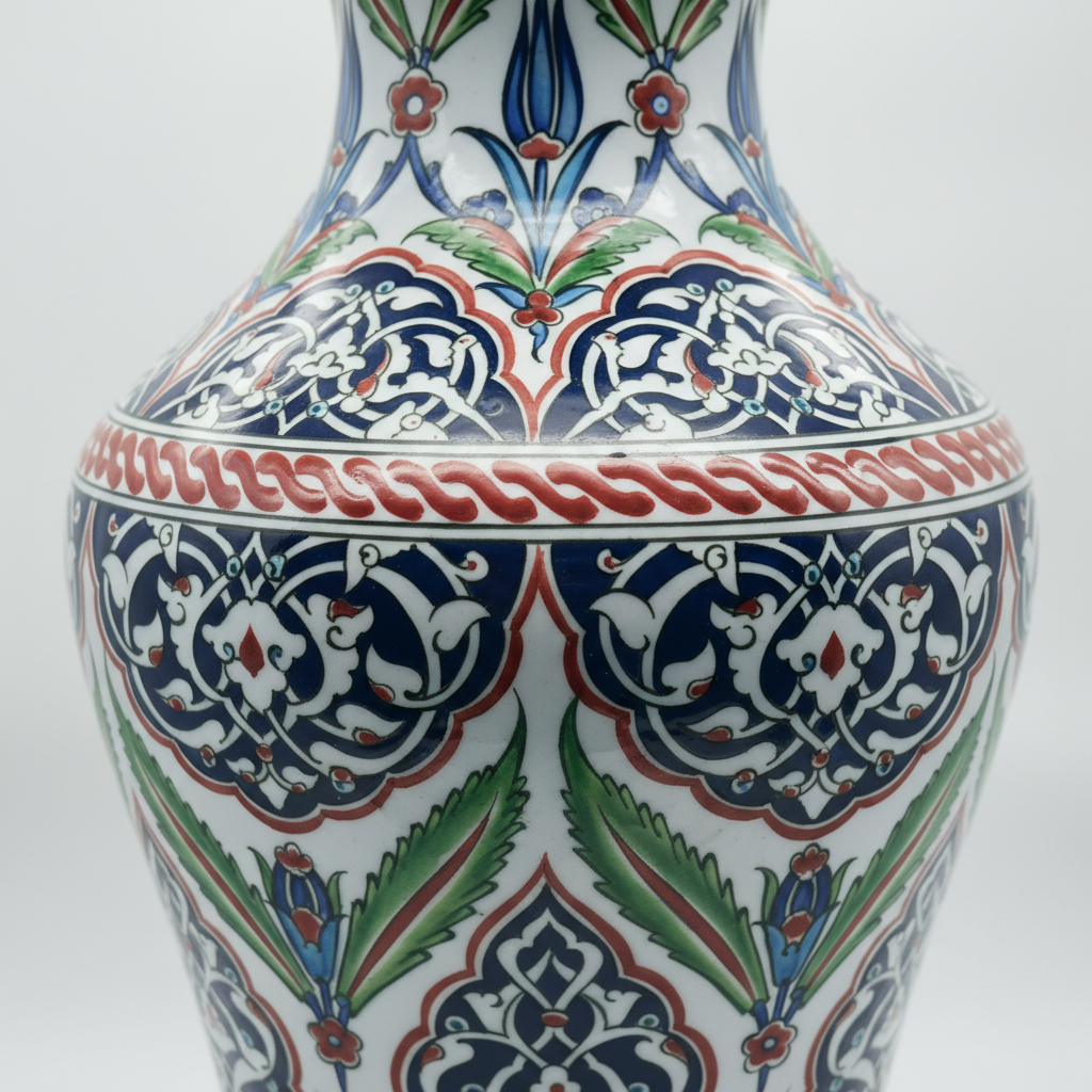 A Symphony of Patterns This vase is a testament to the artisan’s patience. The design is dense and elaborate, featuring the recursive “Rumi” style where patterns flow into patterns endlessly. Deep cobalt blues, earthy reds, and emerald greens intertwine to create a surface that looks like a jeweled tapestry.