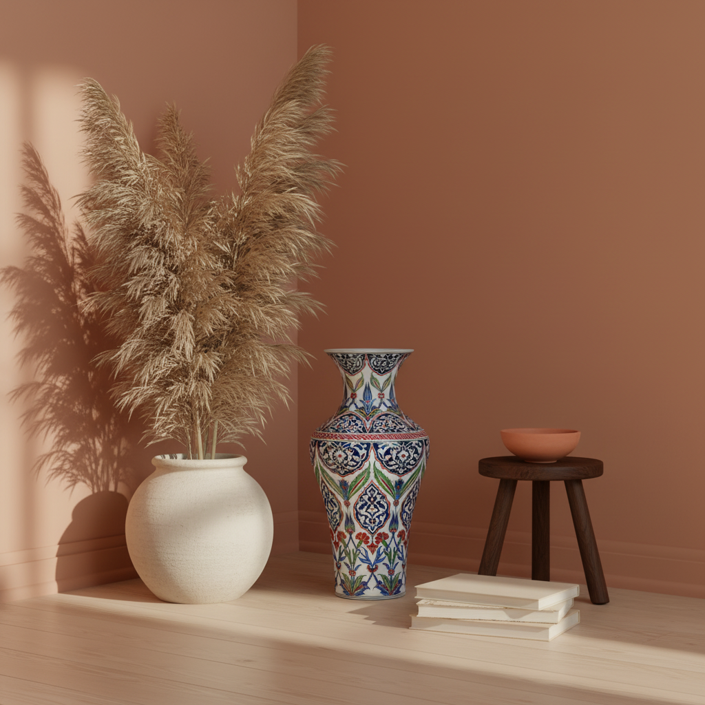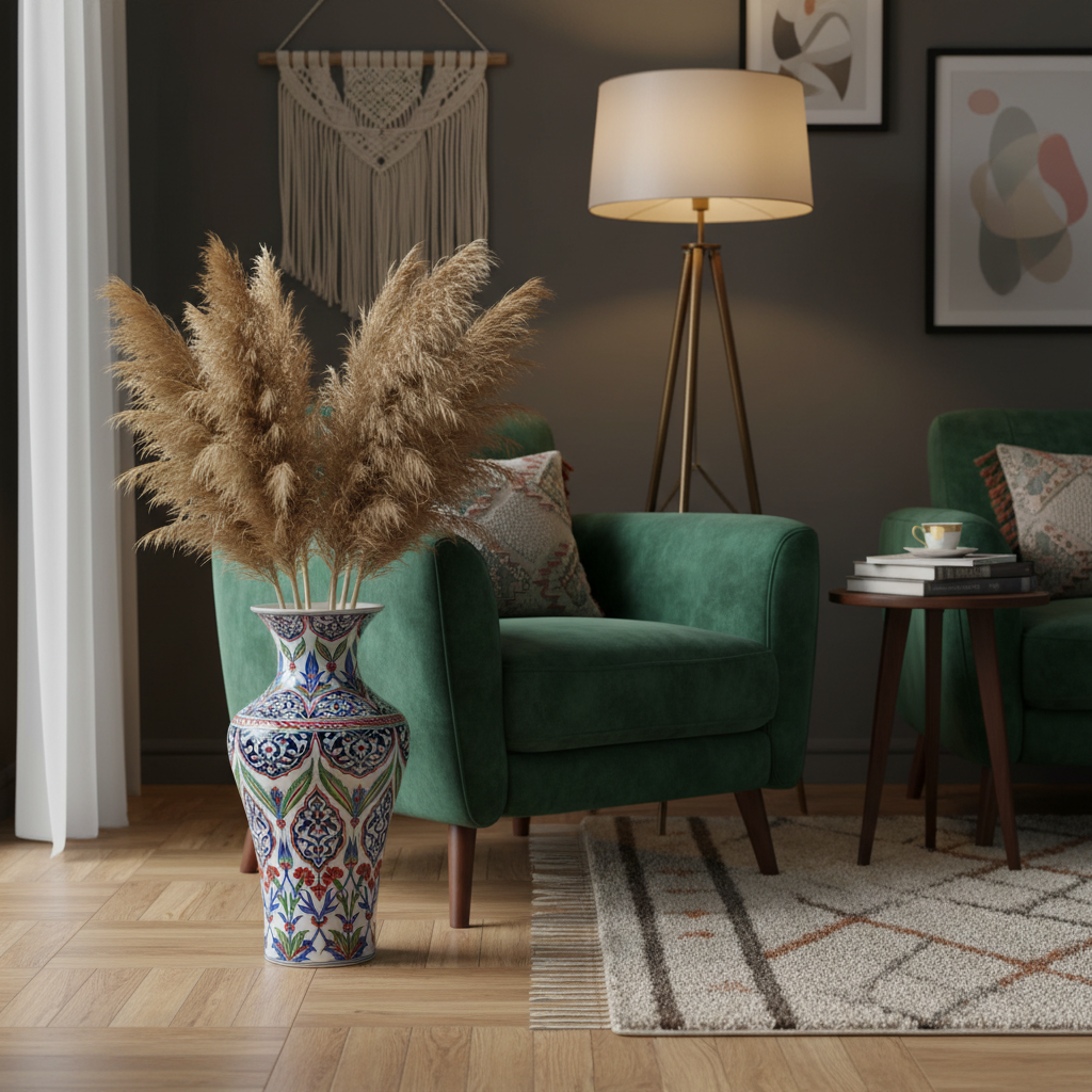 Floor-Standing Grandeur Designed to live on the floor, its silhouette is stable and sweeping. While it honors tradition, our styling shows its versatility: fill it with tall, feathery Pampas grass to soften its lines and introduce a “Bohemian Luxury” vibe to your modern home.