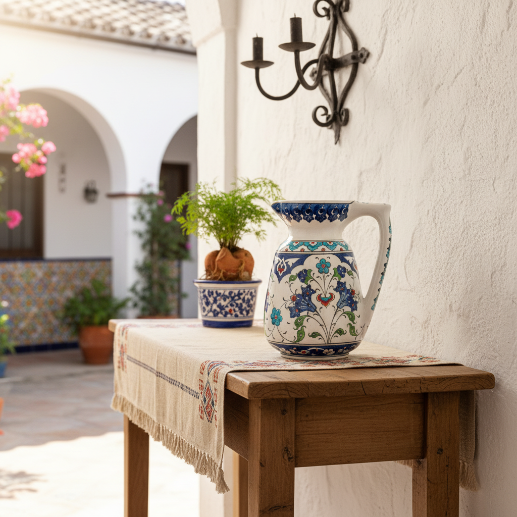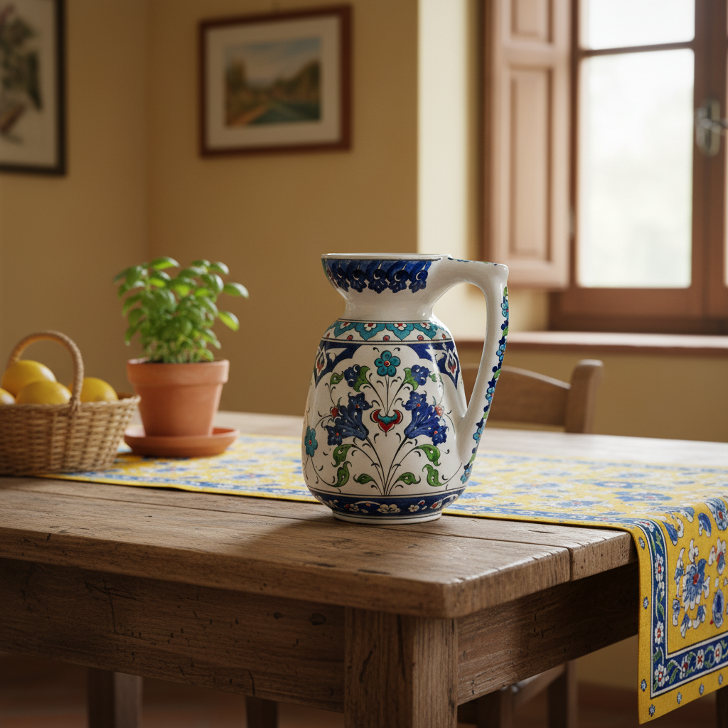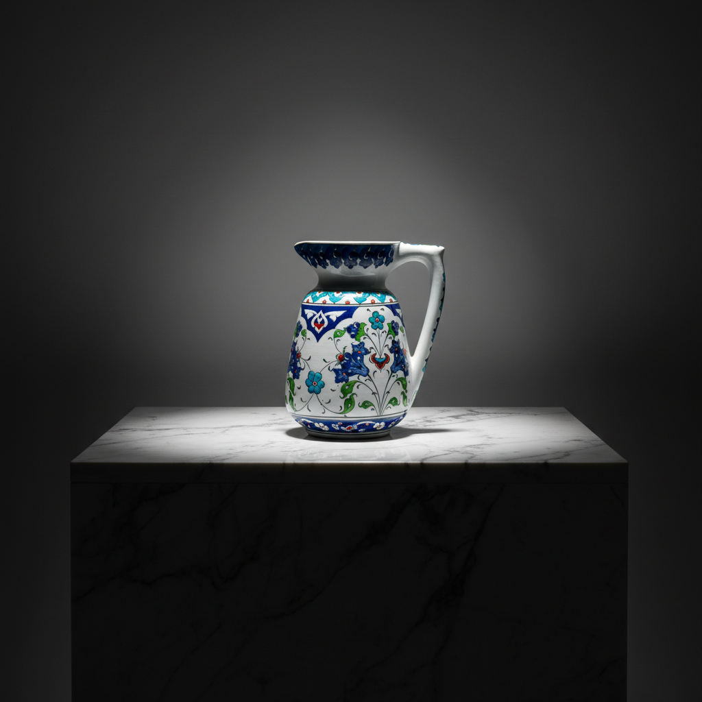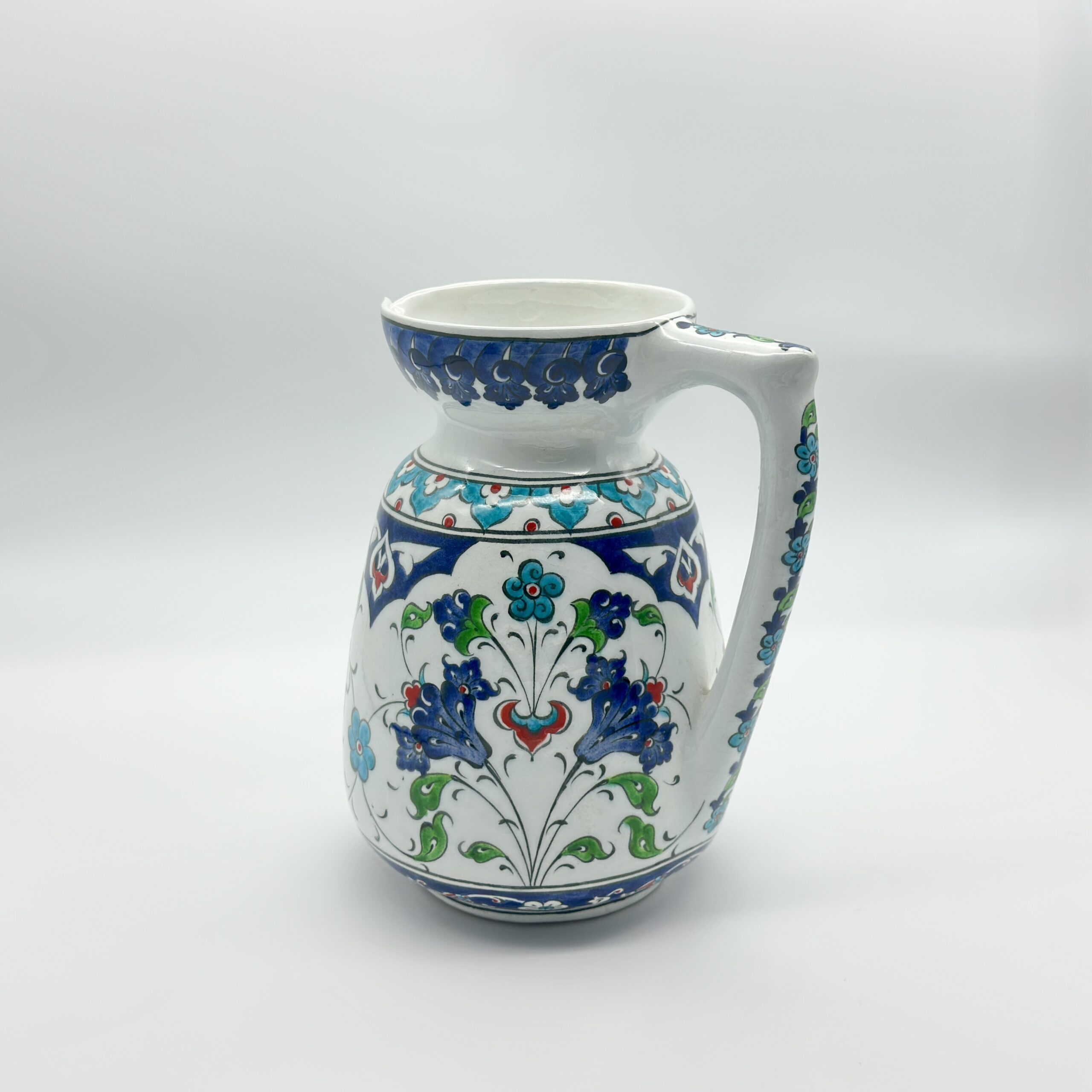 ⚠️ Uniqueness Guarantee: The floral motifs are painted by hand, so the exact arrangement of the bouquet and the brushwork on the arches will vary slightly on every pitcher. This ensures that your piece is a one of a kind original.