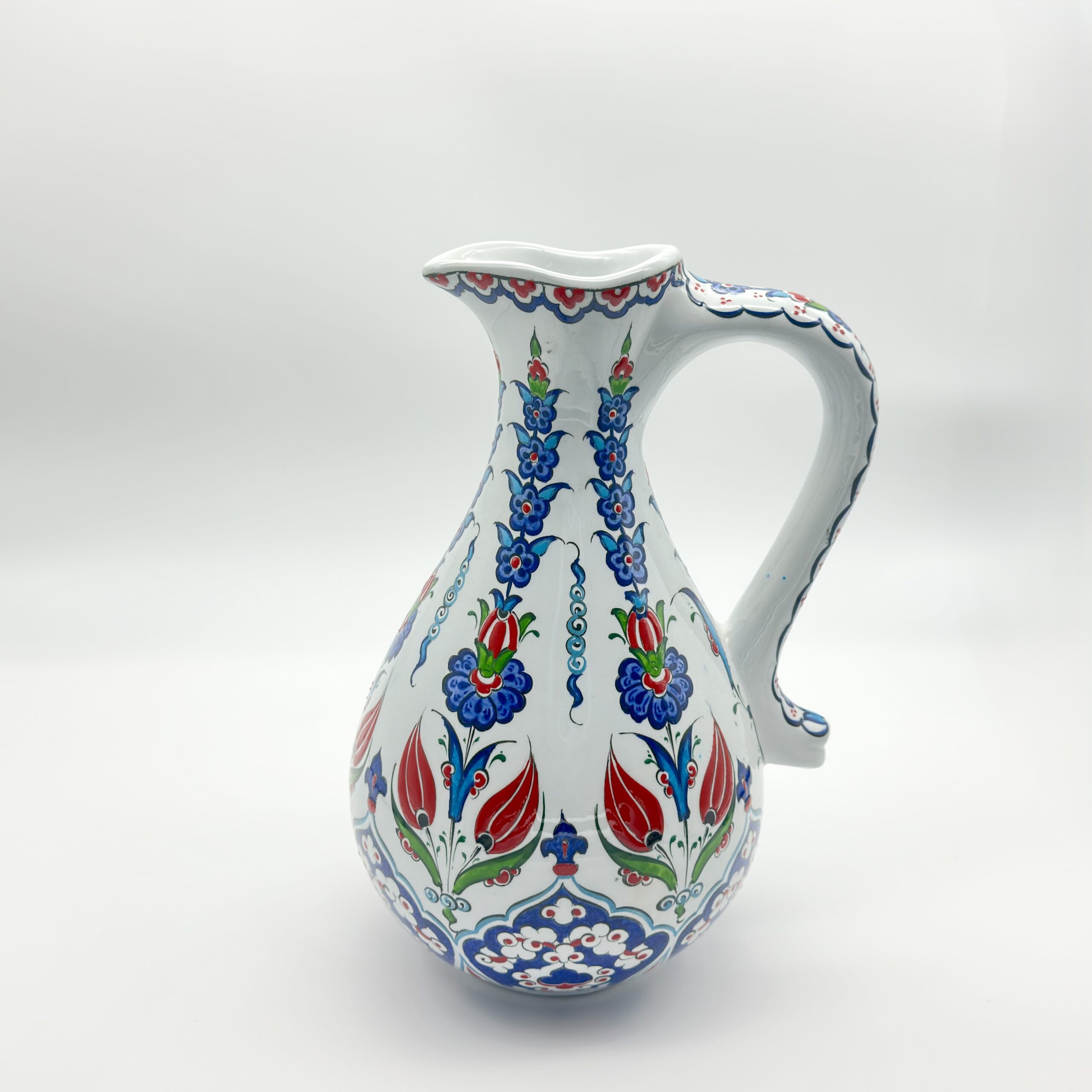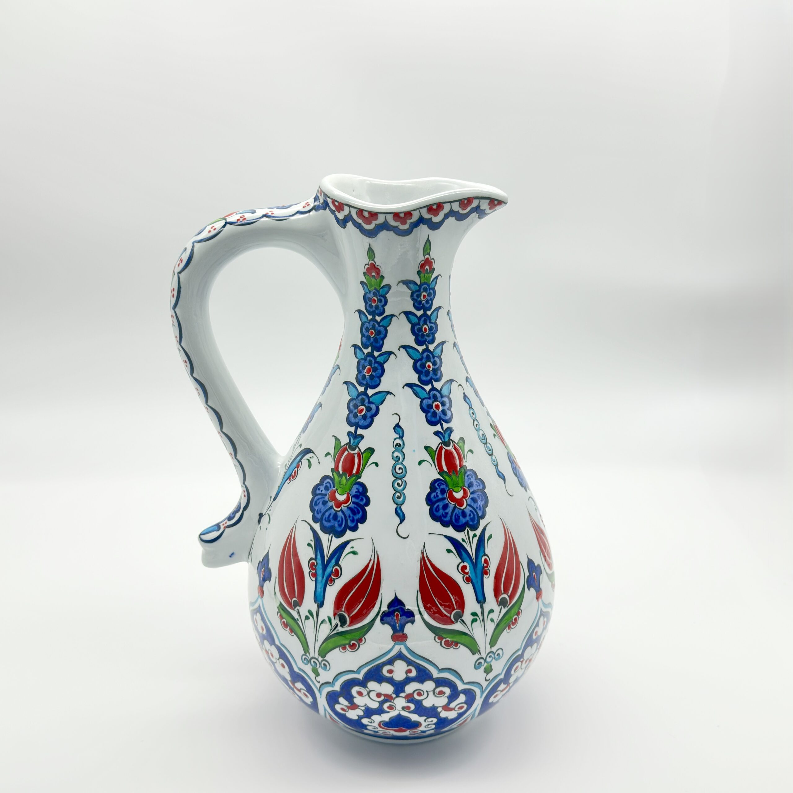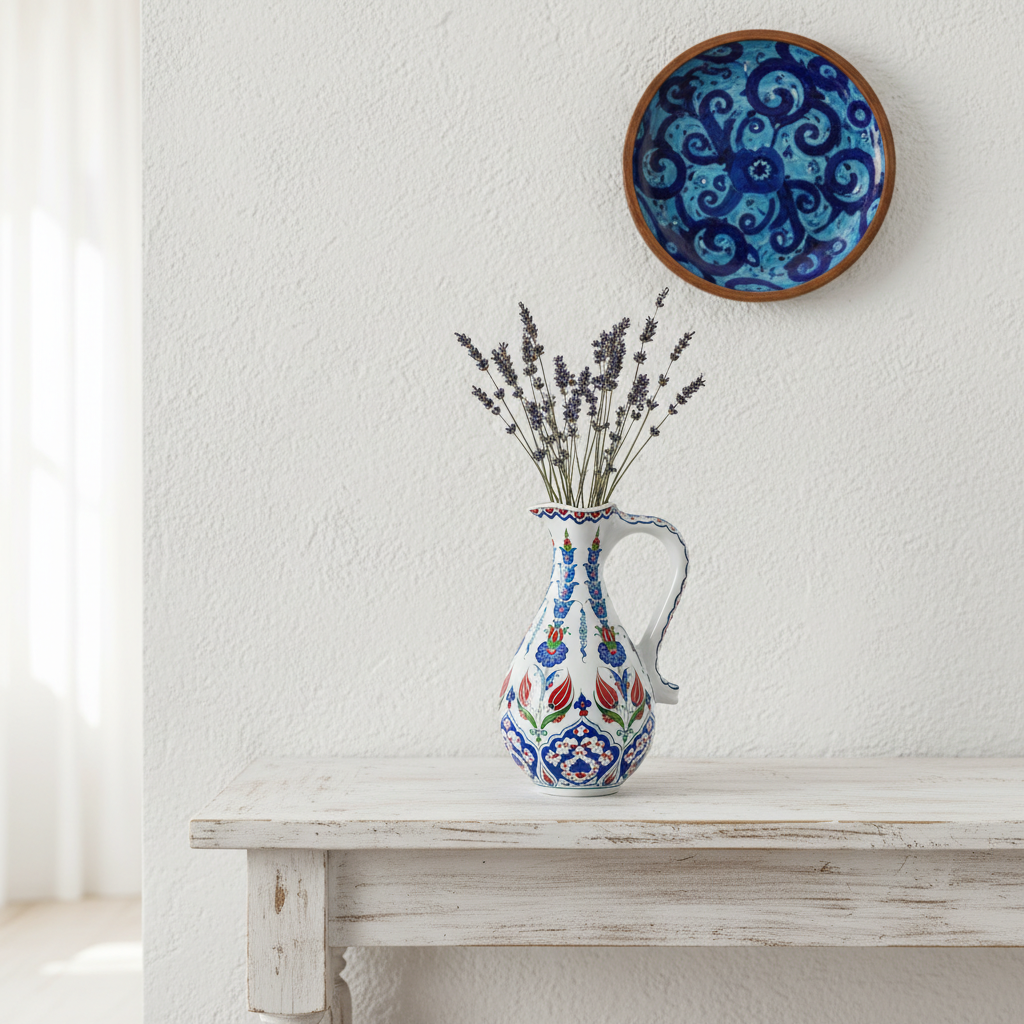 Handmade Ceramic Pitcher Vase (20cm) Traditional Turkish Carnation Pattern with Handle – Decorative Jug Art Decor