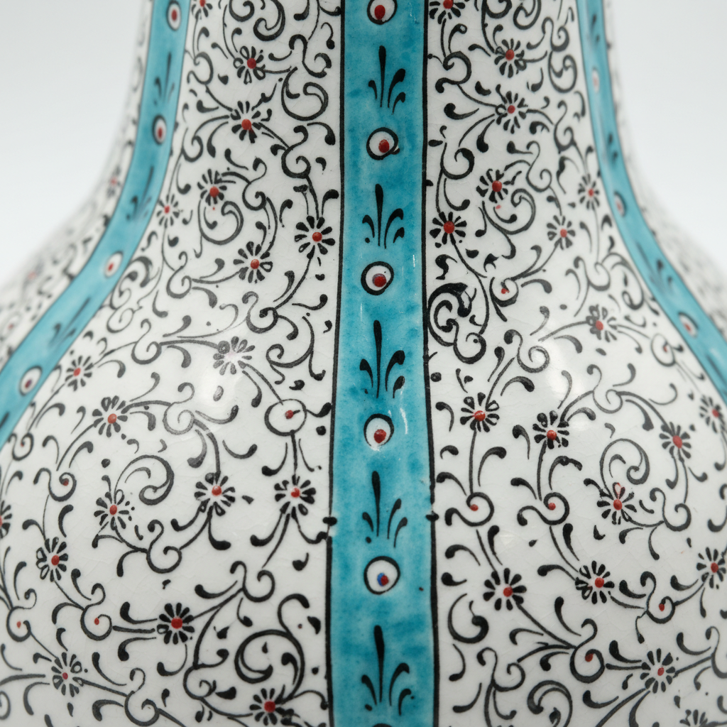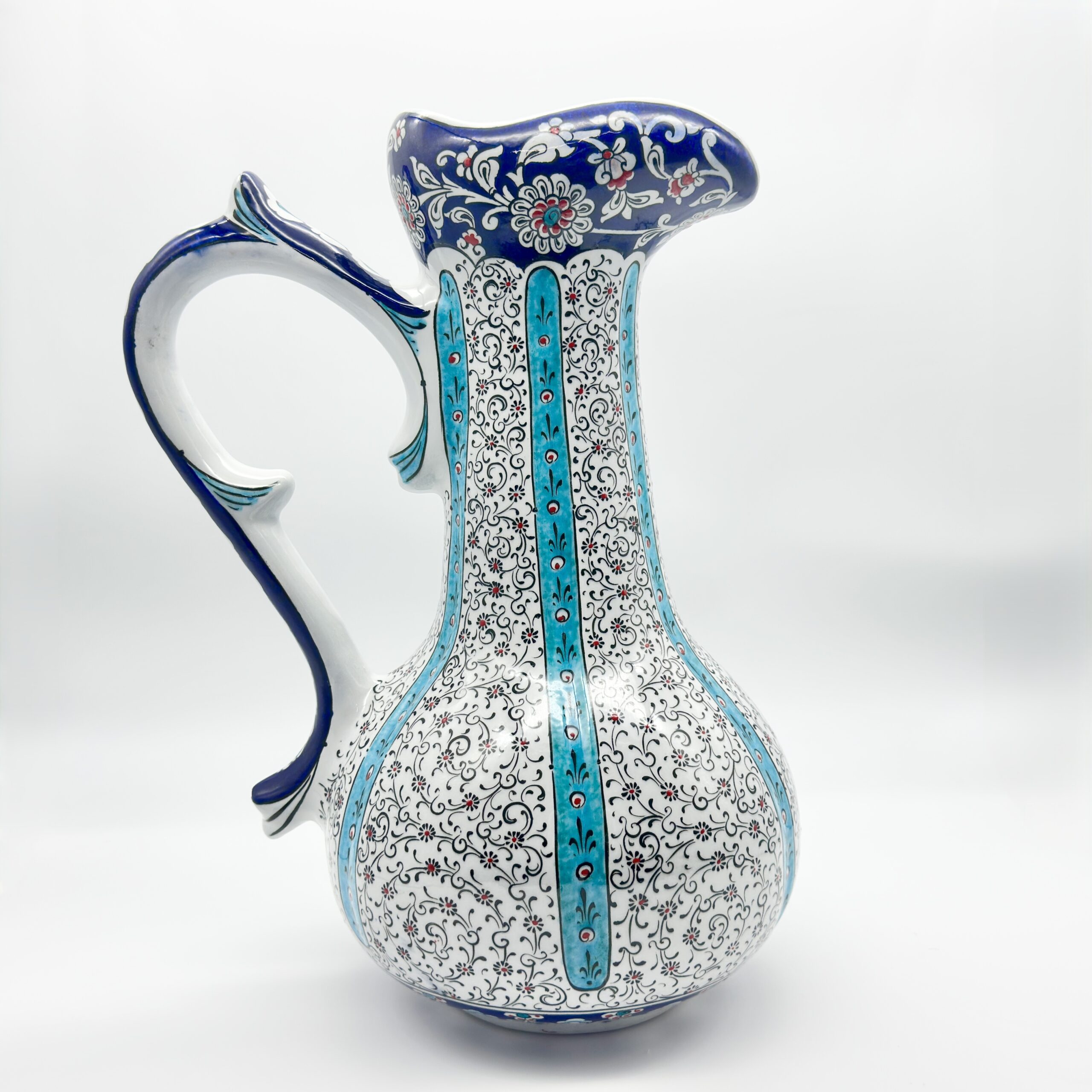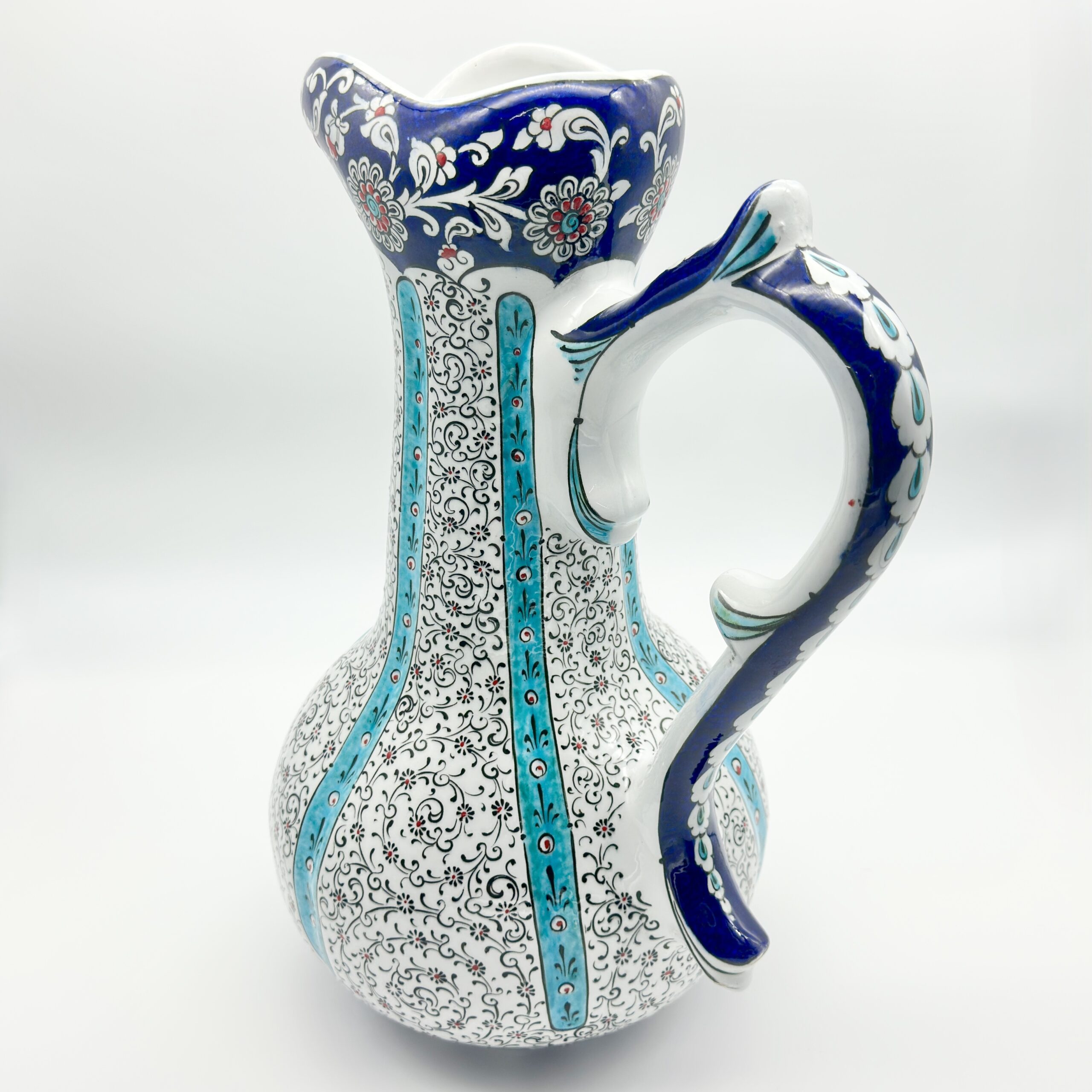 A vision of the Aegean. This tall 40cm handmade ceramic pitcher features the intricate “Golden Horn” scroll pattern, accented with bold vertical stripes of turquoise.