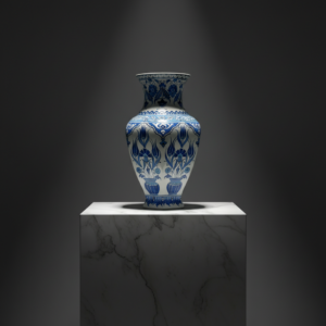 A Marriage of Patterns This piece tells a story of contrast. Look closely, and you will see the “Golden Horn” pattern thousands of tiny, hand painted spirals that invoke a sense of infinity. Step back, and the bold Turquoise Stripes take over, giving the form a strong, vertical rhythm that echoes the columns of classical architecture.