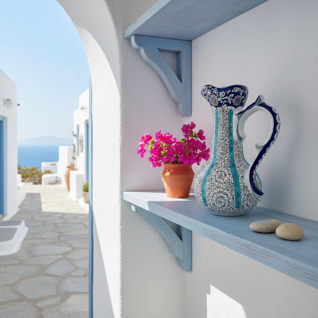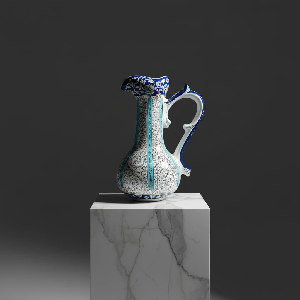 This Handmade Ceramic Decorative Pitcher is a triumph of form and pattern. More than a vessel, it is a piece of sculpture. By merging the ancient, spiral-laden “Golden Horn” technique with bold turquoise architecture, it creates a presence that is both historically rich and refreshingly modern.