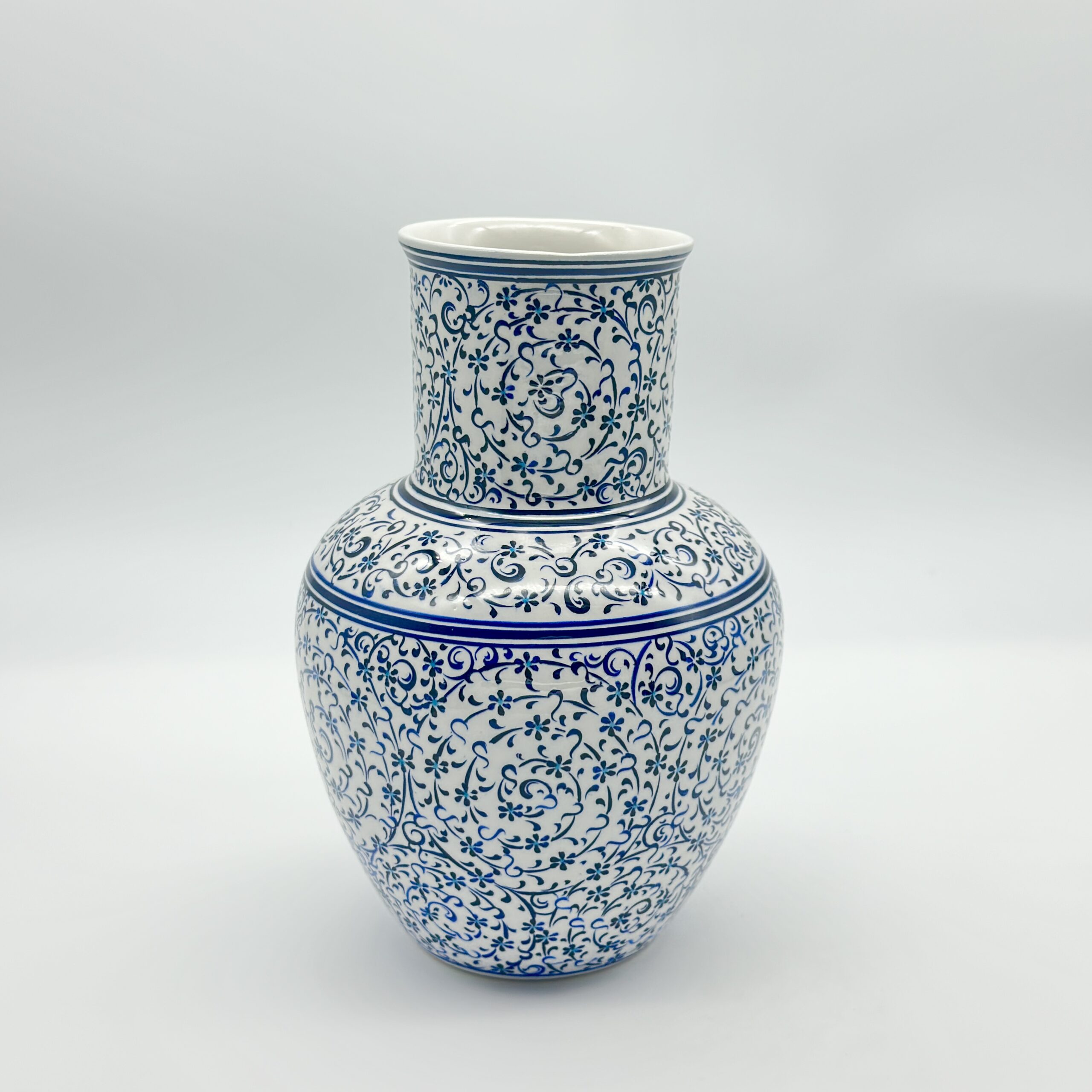 Handmade Ceramic Vase (20cm) – Blue and White Golden Horn Halic Pattern – Spiral Scrolls Design