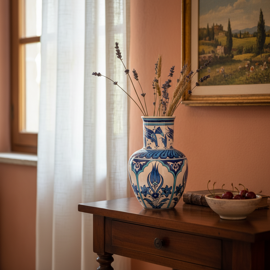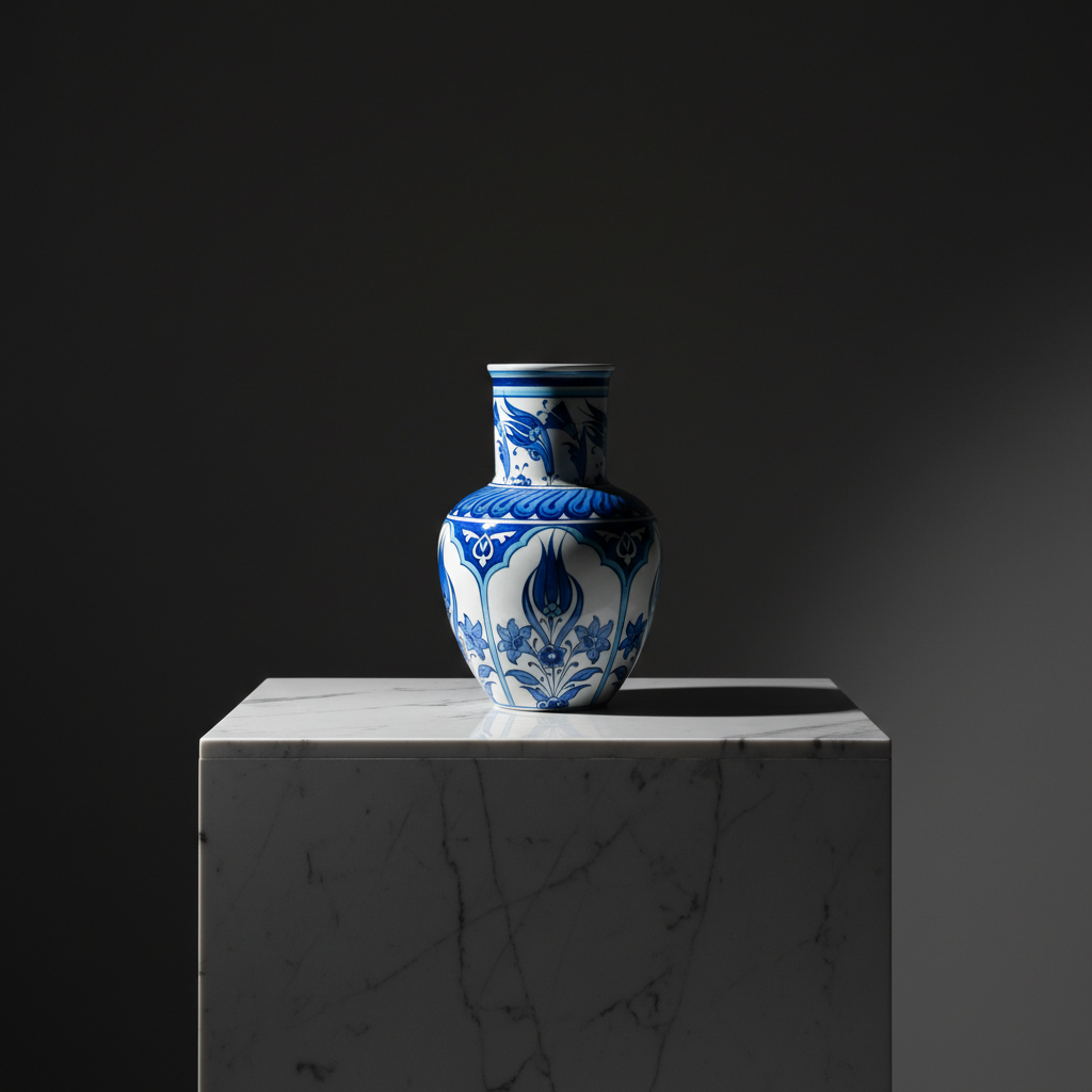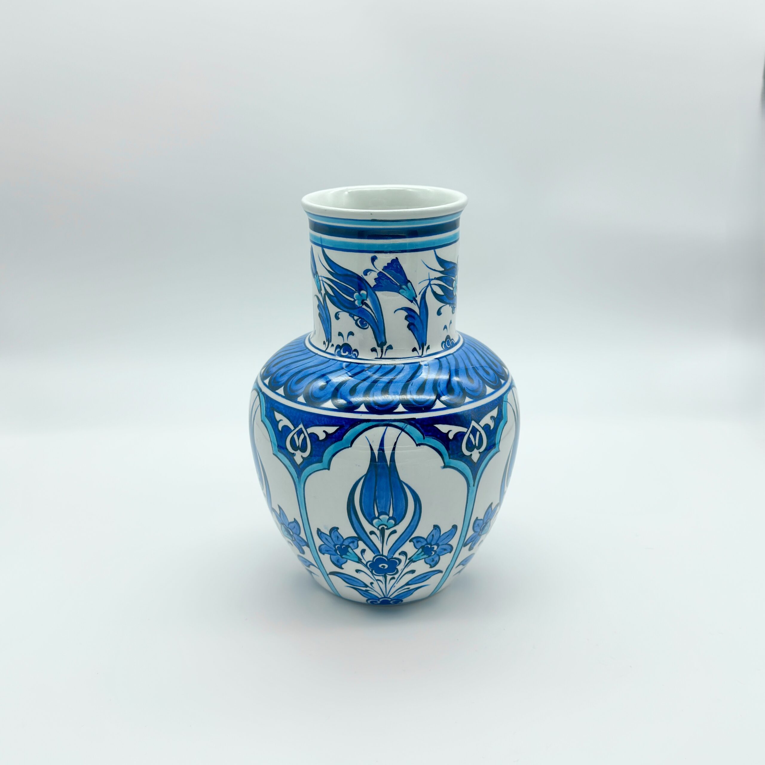 This Handmade Ceramic Vase reimagines the classic Iznik form in a pure “Blue and White” palette. Standing at 20 cm, it combines the structured elegance of the “Shoulder Vase” with the timeless beauty of monochrome painting.