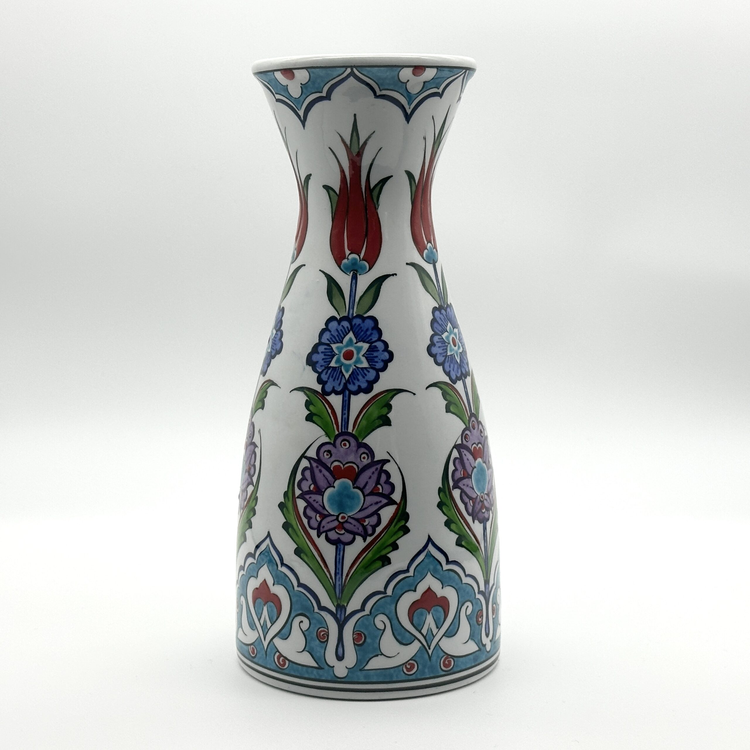 Handmade Ceramic Vase (25cm) Traditional Turkish Red Tulip & Purple Floral Pattern – Elegant Conical Art Decor