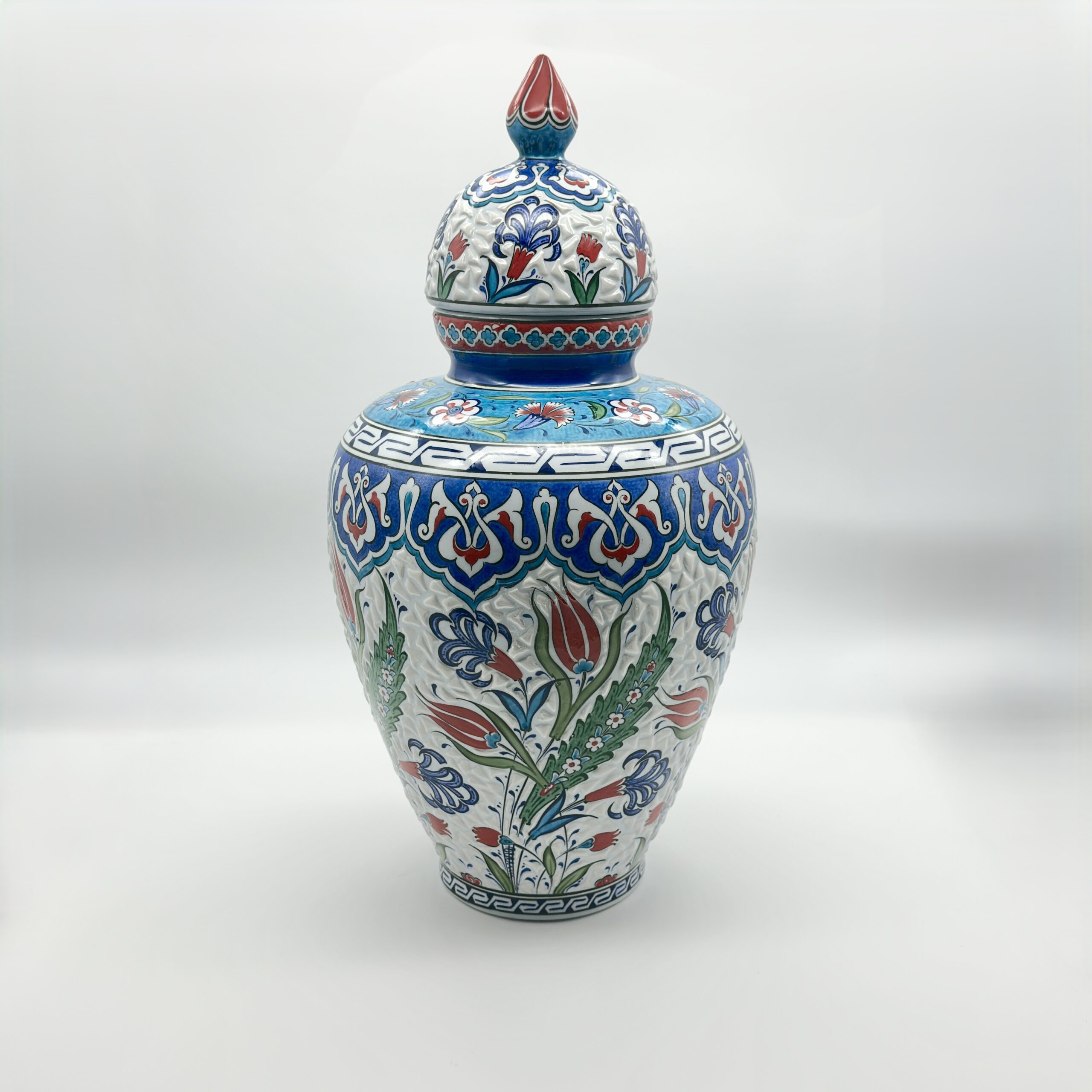 Handmade Ceramic Vizier Jar (30cm) Carved Relief Texture and Ottoman Red Tulips