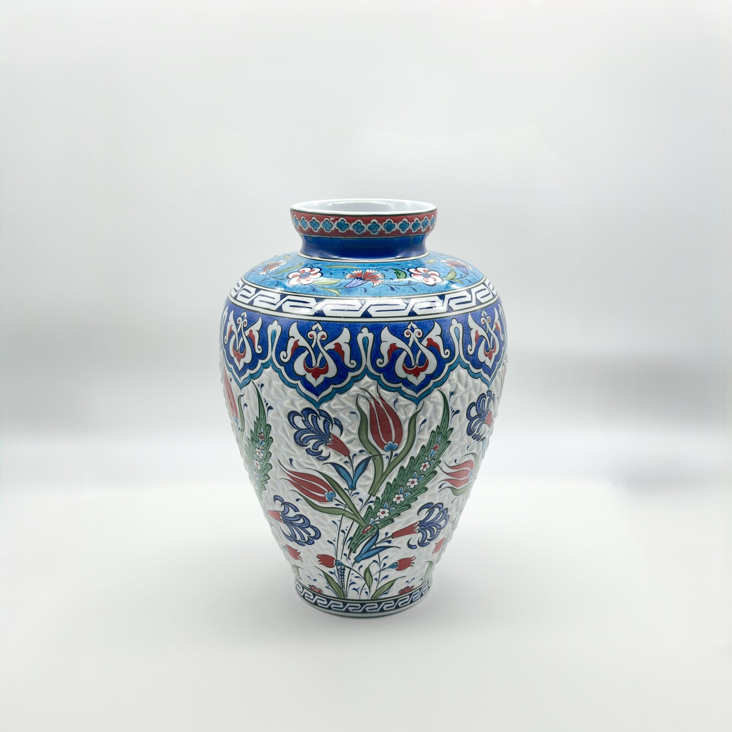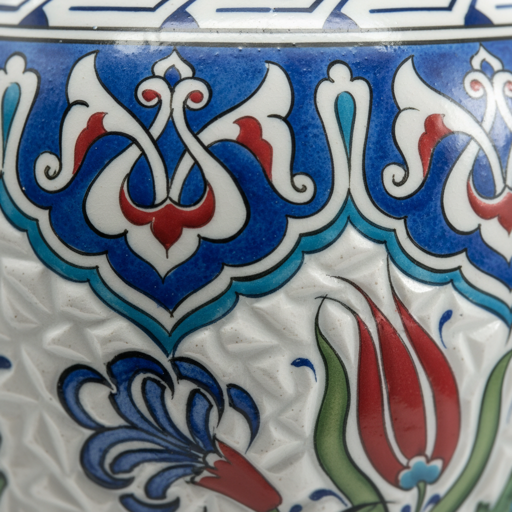⚠️ Uniqueness Guarantee: The relief texture is applied by hand before firing. The density of the carving and the brushwork of the tulips will vary slightly on every jar, ensuring that your Vizier Vase is a one of a kind original.